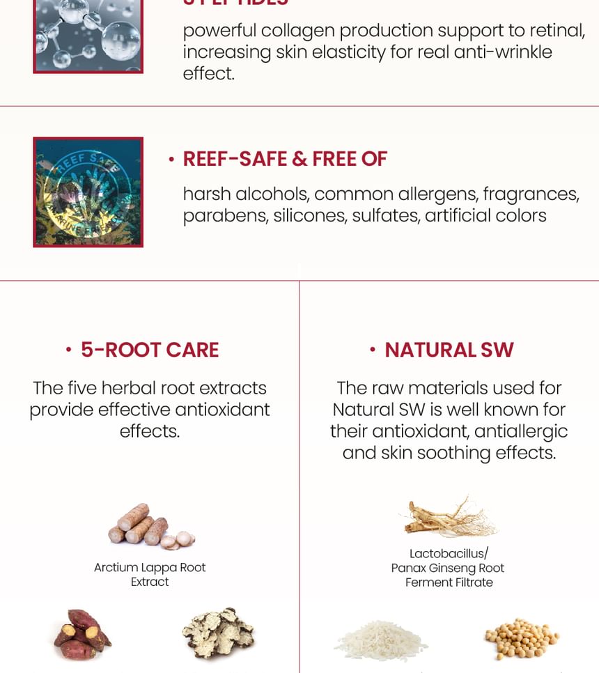 - 保濕與舒緩:添加腺苷(Adenosine)、巴庫奇醇(Bakuchiol)、維生素 E 和三種胜肽,提供深層滋潤,減少眼部乾燥和刺激,適合熟齡或疲勞肌膚。