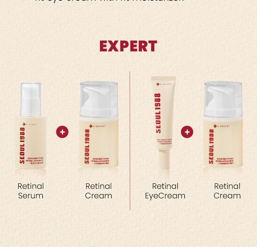 KSECRET SEOUL 1988 眼霜是一款來自韓國 KSECRET 品牌的抗老眼部護理霜,容量為 30ml,專為眼周細紋、皺紋、眼袋和黑眼圈設計,靈感源自首爾 1988 年的復古風格,結合高濃度視網膜脂質體和天然發酵成分,提供強效抗衰老與提亮效果。產品採用脂質體技術封裝 4% 視網膜(Retinal),比傳統維生素 A 衍生物更溫和高效,深入眼周肌膚促進膠原蛋白生成,同時融入大豆發酵萃取物(Fermented Bean),自然亮白並強化肌膚屏障,適合初次使用視黃醇的敏感眼部肌膚。質地輕盈絲滑,吸收快速,不油膩,已通過眼部刺激測試,廣受 K-beauty 愛好者好評。