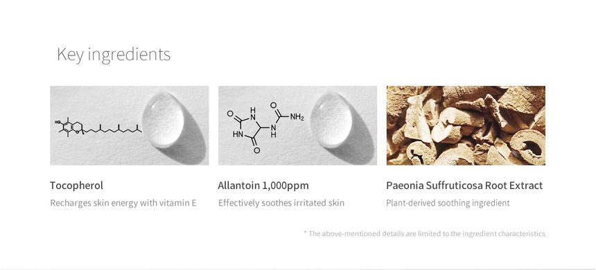抗老化與舒緩:添加Aquatide®(專利抗老化胜肽),具有比維生素C更強的抗氧化效果,幫助減緩肌膚老化、修復環境傷害並改善炎症。另含尿囊素、維生素E(生育酚)與芍藥根萃取,舒緩敏感肌膚,減少刺激。