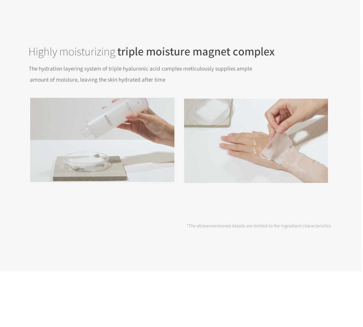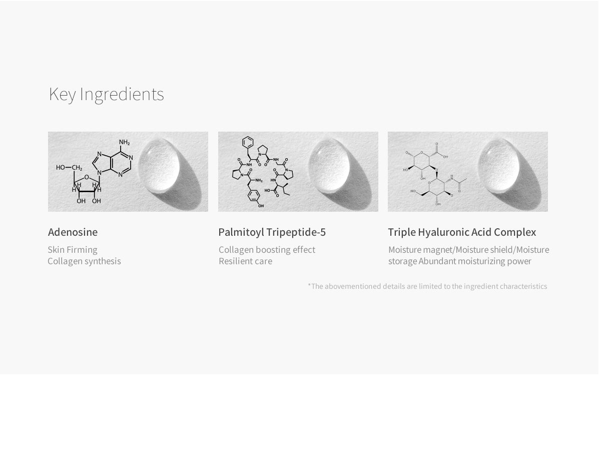 深層保濕:含三重玻尿酸複合物(Hyaluronic Acid、Hydrolyzed Hyaluronic Acid、Sodium Hyaluronate),分別作為「水分磁鐵」、儲水層與保濕屏障,深層補水並鎖住水分,改善乾燥與粗糙肌膚,打造水潤膚感。