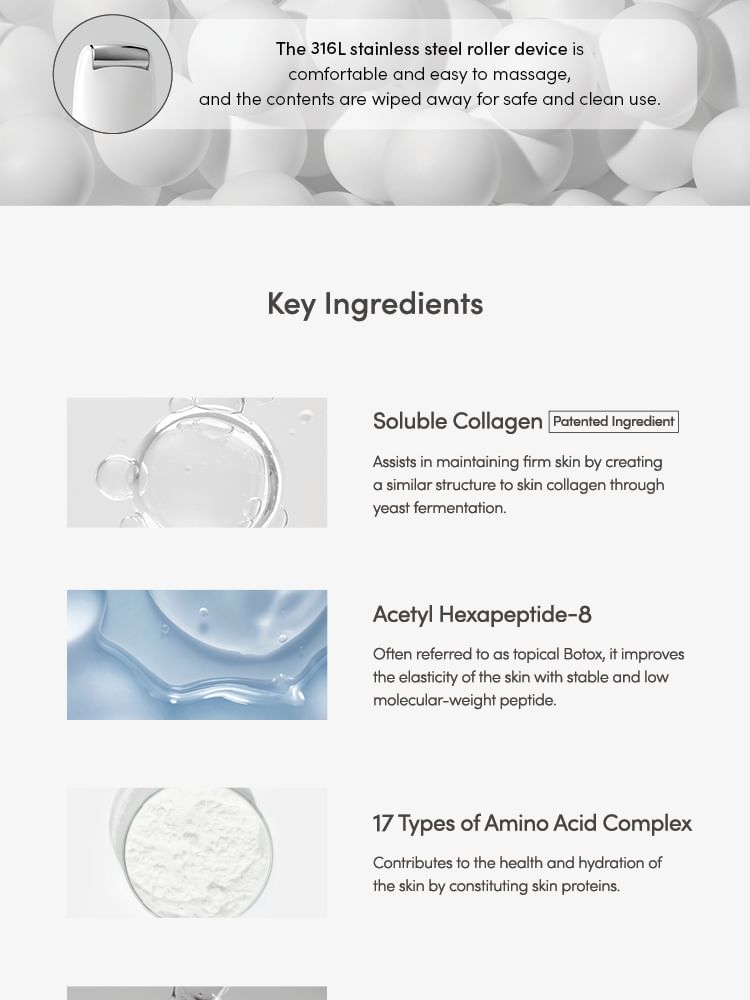 蘊含可溶性膠原蛋白、乙醯基六肽-8、17種胺基酸複合物及植物發酵角鯊烷,提升肌膚彈性,強效保濕,並形成營養膜。