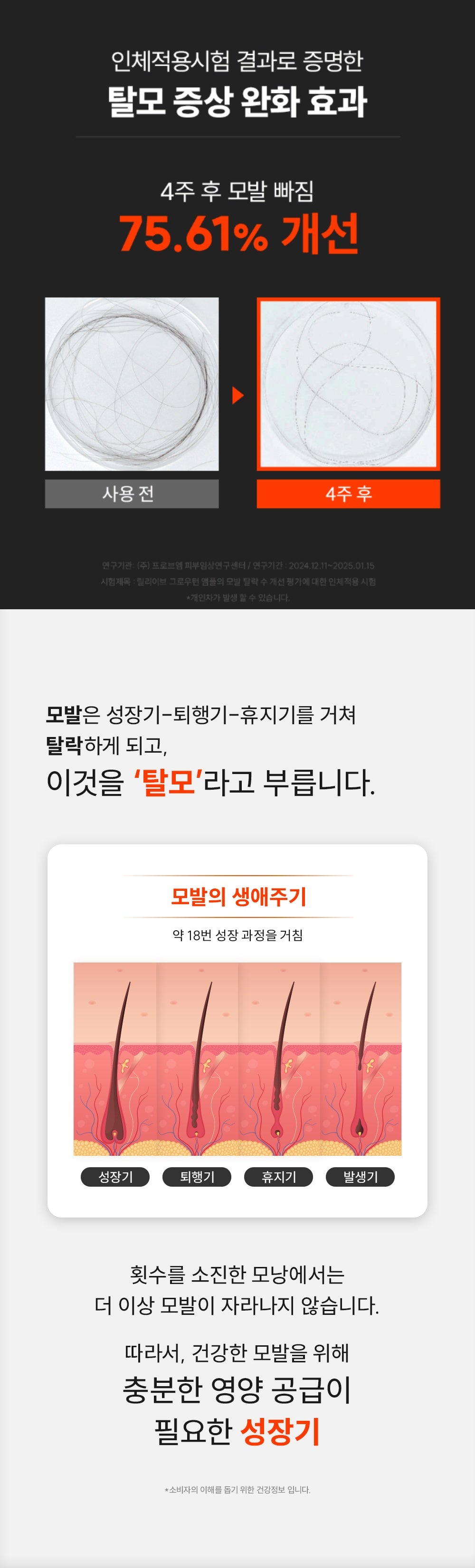.4周明顯改善:毛髮脫落、頭皮角質、頭皮保濕、頭皮發熱(*實驗數據僅供參考,具體效果因人而異)