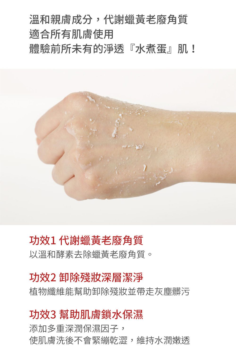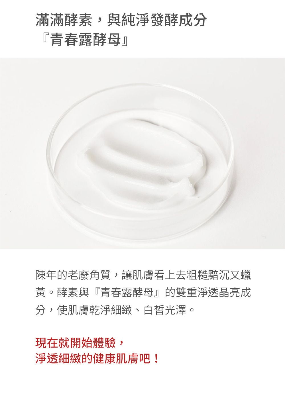 青春露酵母(Galactomyces半乳桿菌發酵濾液)全能淨化去角質凝膠,以酵素喚醒純淨肌膚,使肌膚光滑透亮。選用植物來源的纖維素不需要擔心過度刺激,纖維素+酵素雙效深層清潔,將陳舊角質廢物掃除,找回細緻光滑的肌膚!