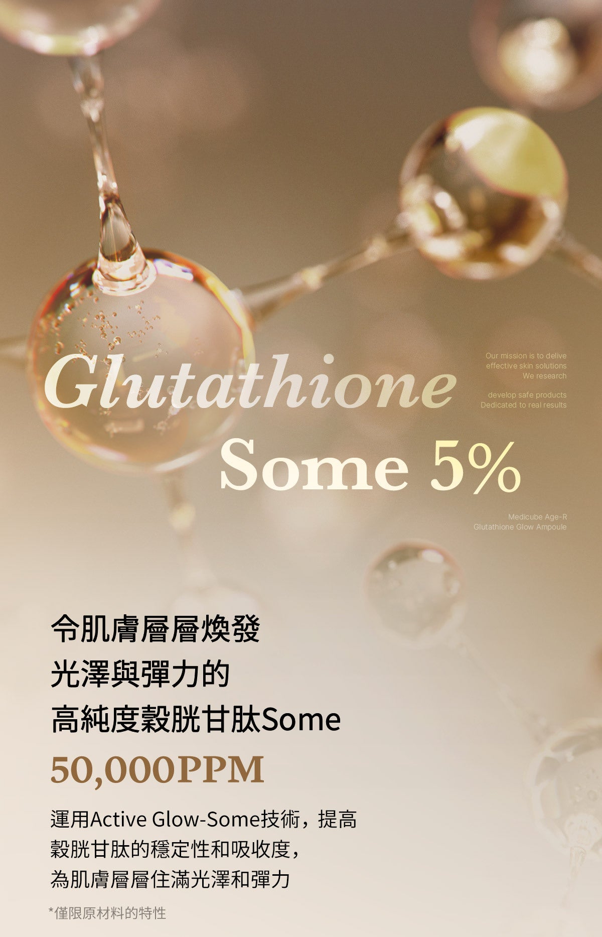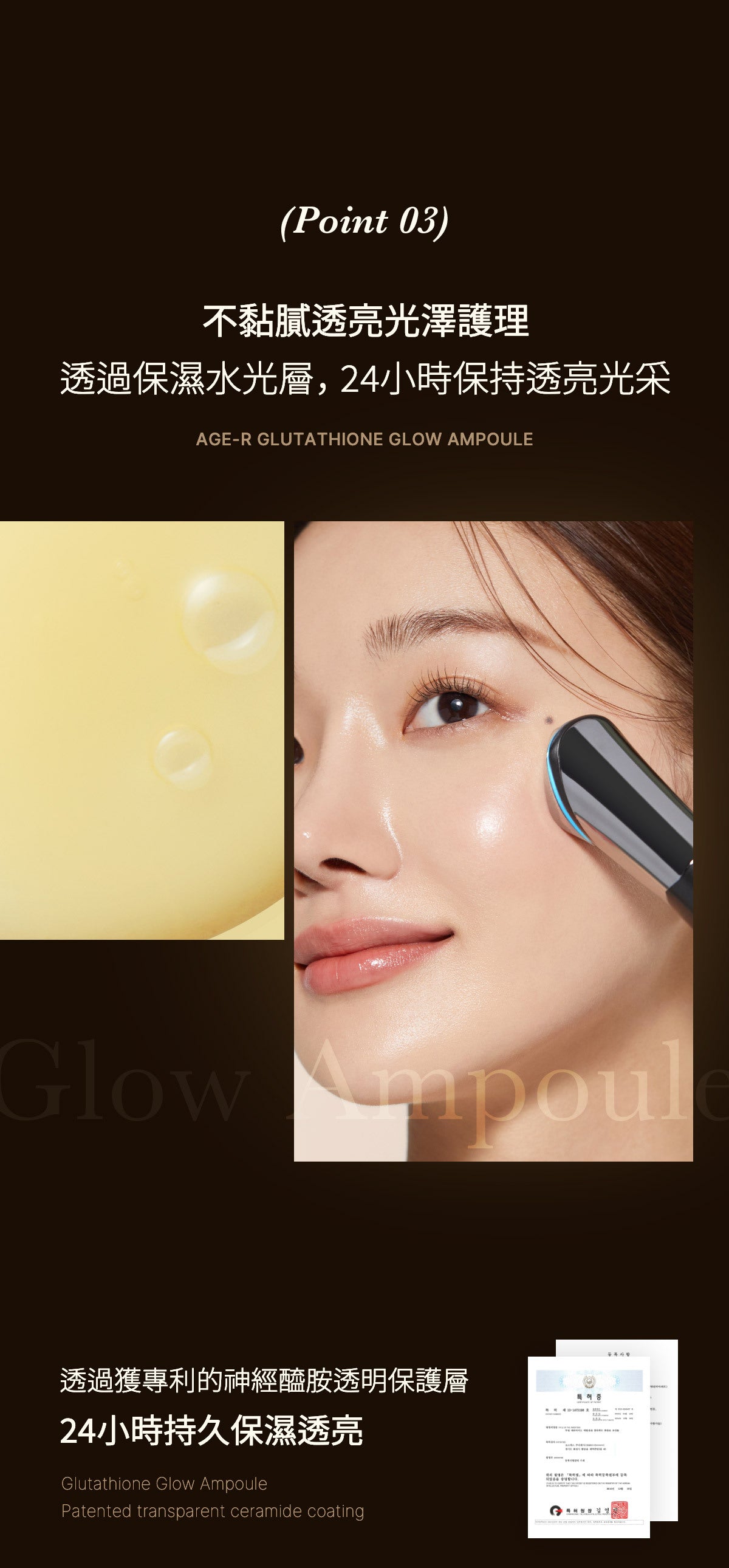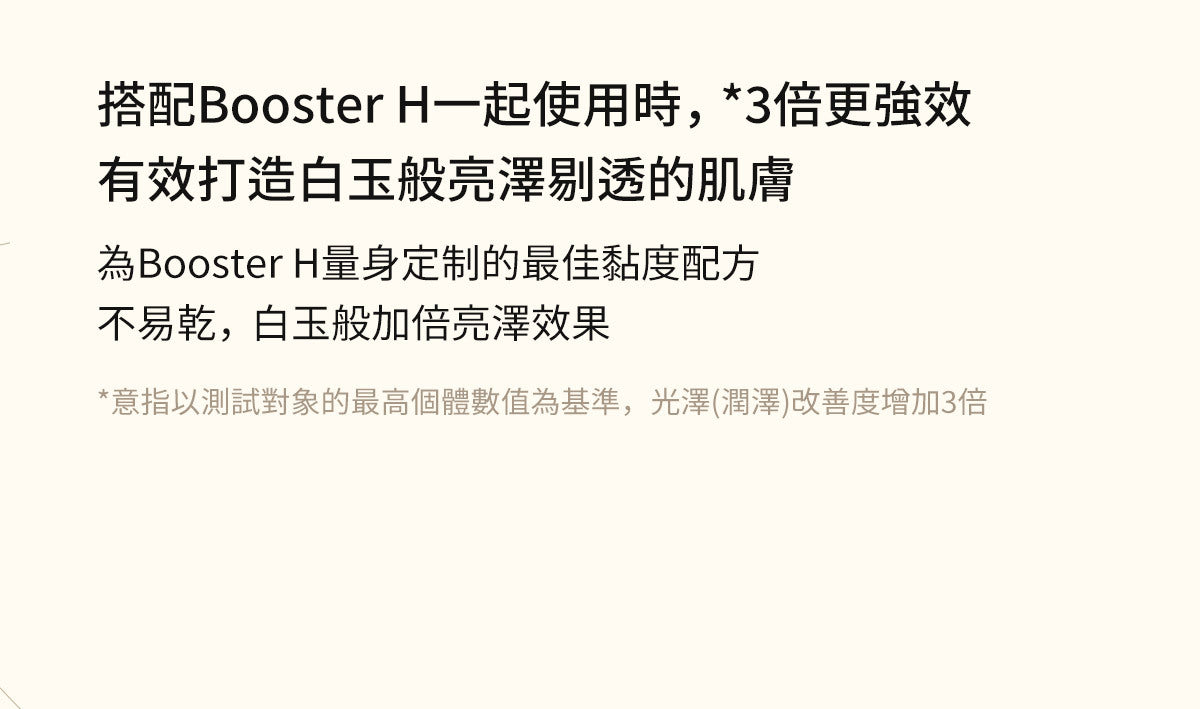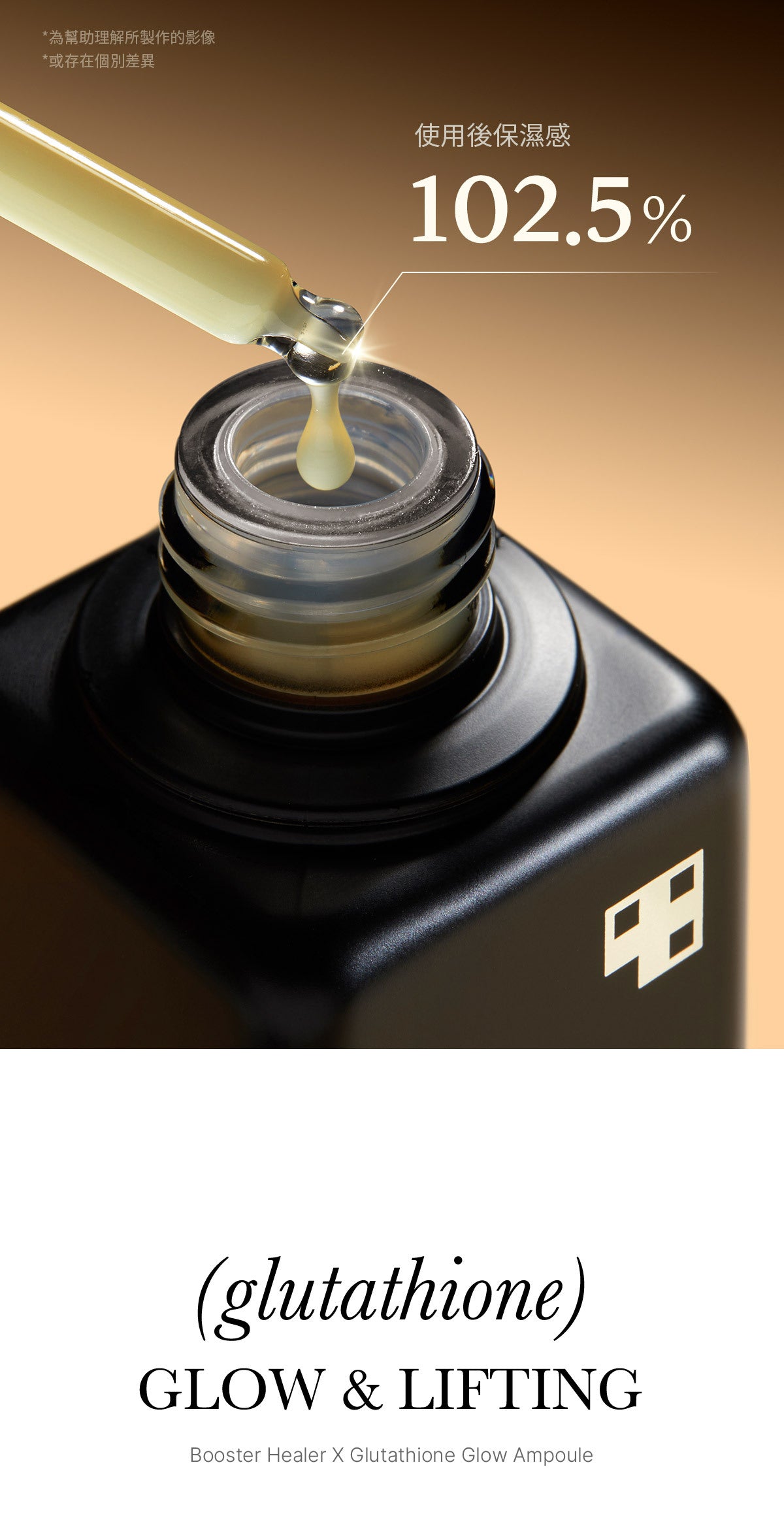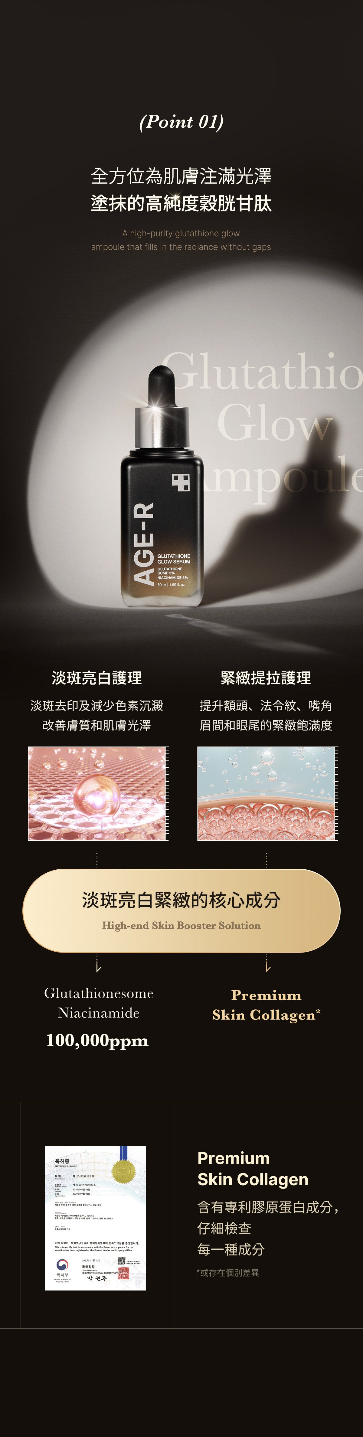採用 Active Glow-zom 技術,含有穀胱甘肽 (50,000ppm)、菸鹼醯胺、腺苷、專利類膚膠原蛋白和 Bifida 發酵裂解物。這種有效的組合可增強皮膚的自然光澤,消除瑕疵、斑點和色素沉著。