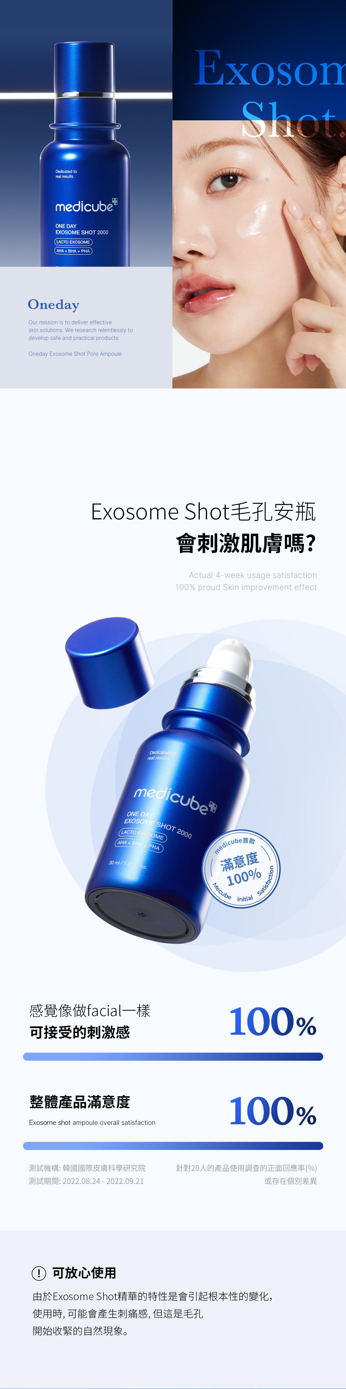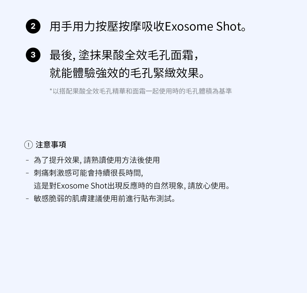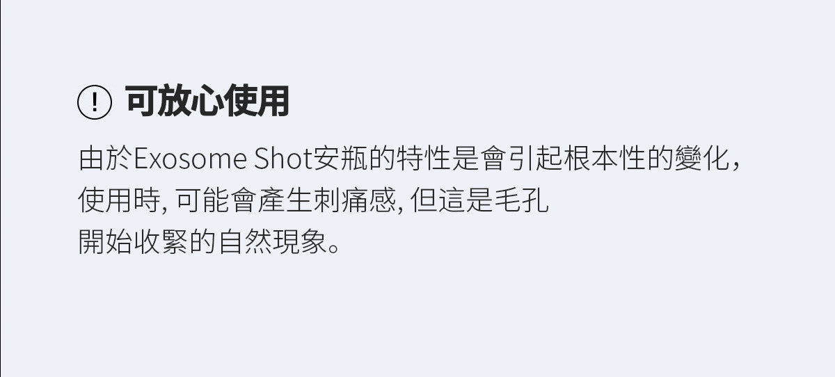 Exosome Shot Ampoule 含有天然衍生的微粒成分,使用時可能會引起刺痛感。
