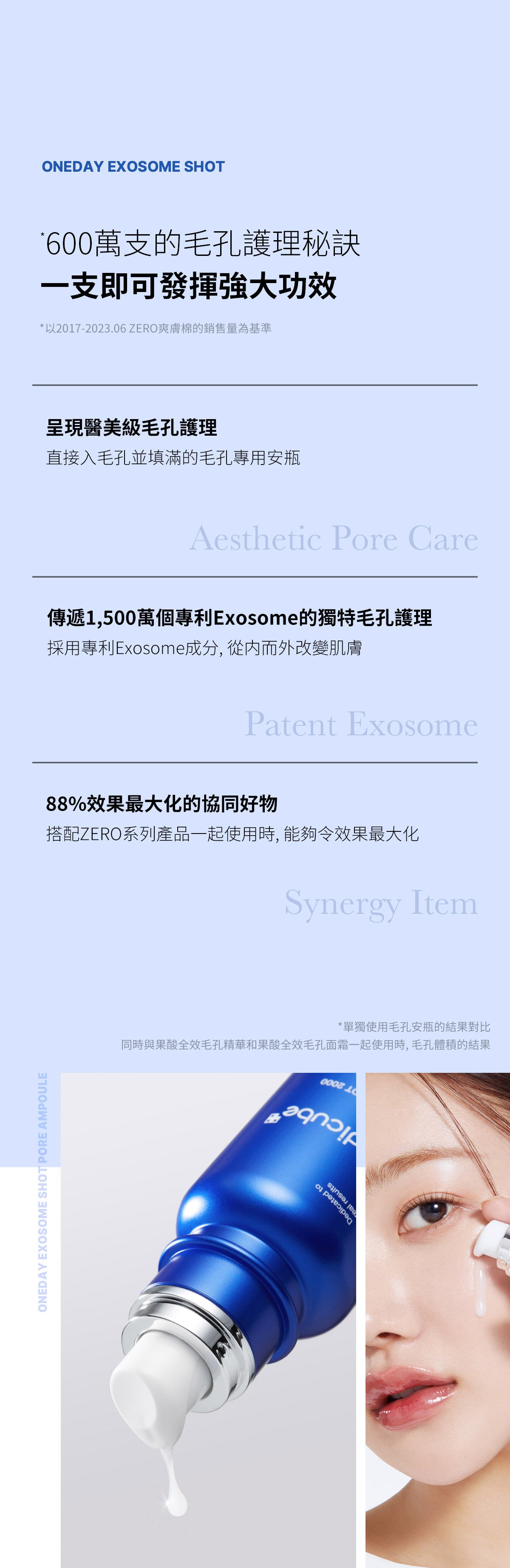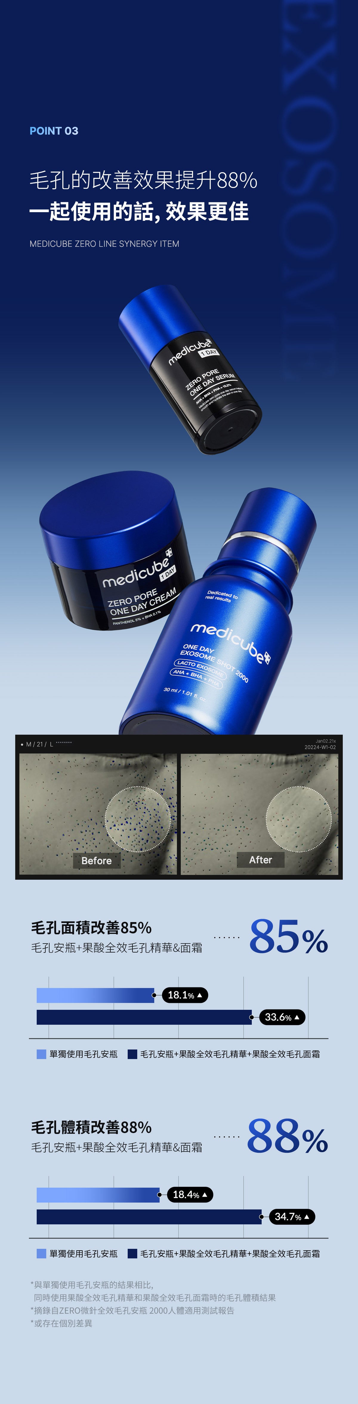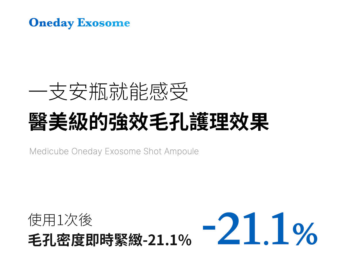 與單獨使用 Exosome Shot 相比,與 Exosome Shot 結合使用時,一日精華液和一日霜可將毛孔體積改善 88%,毛孔面積改善 85%。為了更有效管理毛孔,我們建議先使用 Exosome Shot Ampoule,然後使用一日精華,最後使用一日霜。