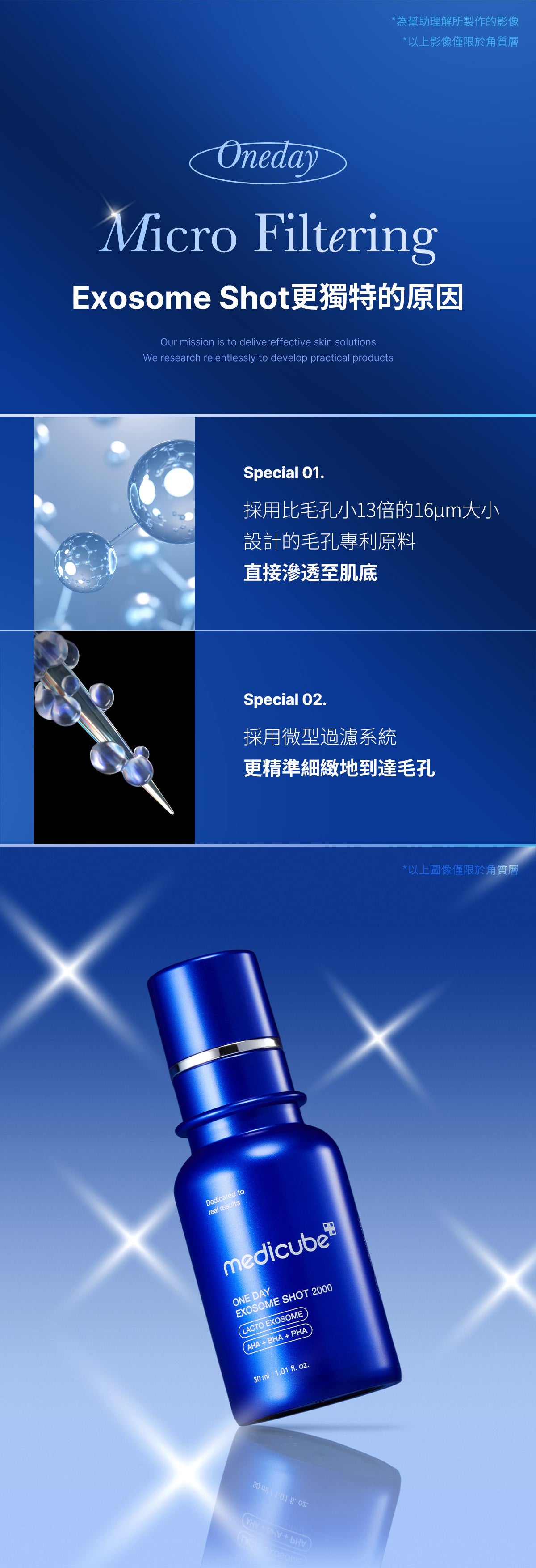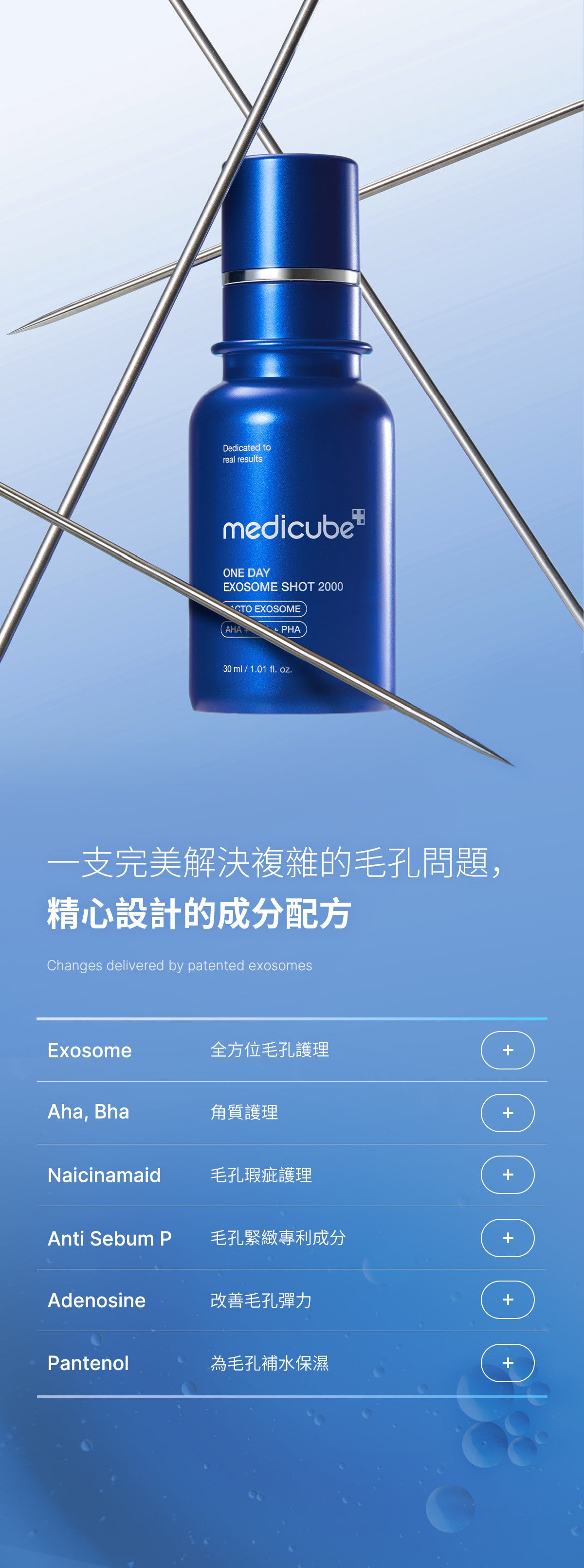 根據微針原理,我們製作了一種微型針狀助推器,以解決一系列皮膚問題。配方經過 15M 專利外泌體注射增強,可將活性成分物理輸送到毛孔,為家庭提供日常強化護理。經過臨床驗證,可護理毛孔大小、平滑肌膚紋理、強化皮膚屏障並促進膚色容光煥發。