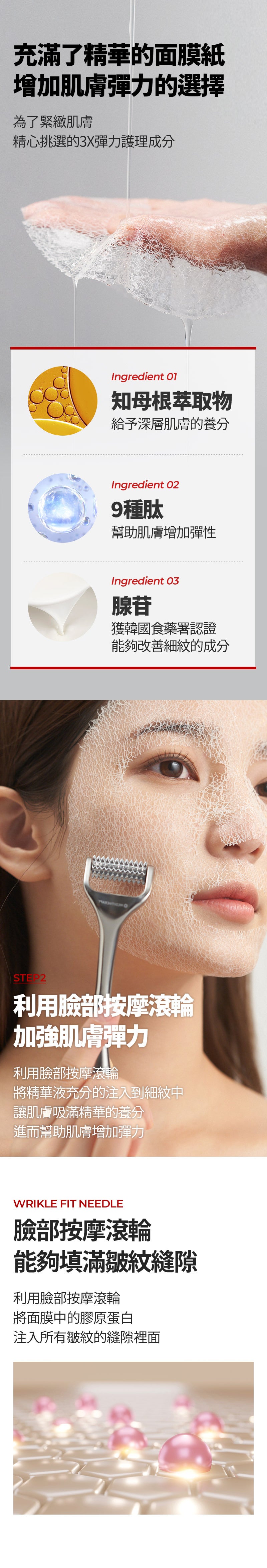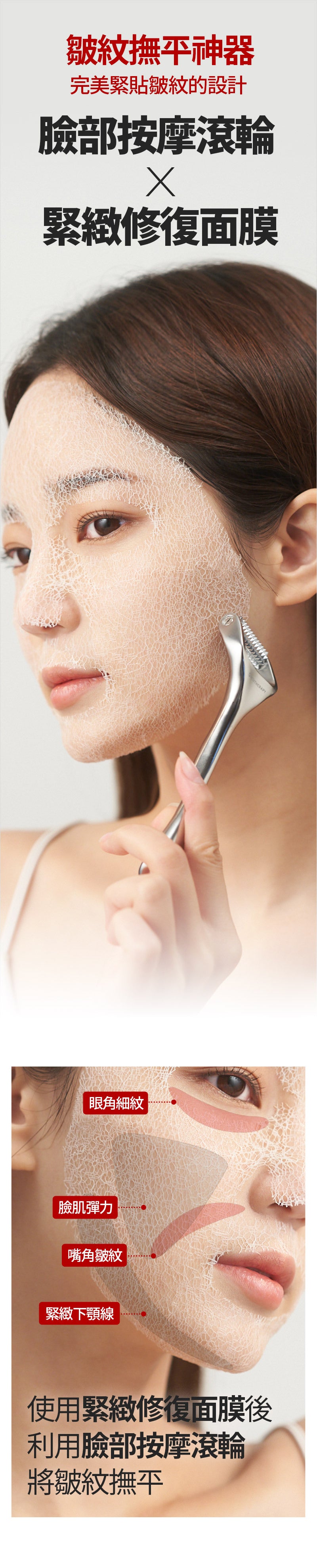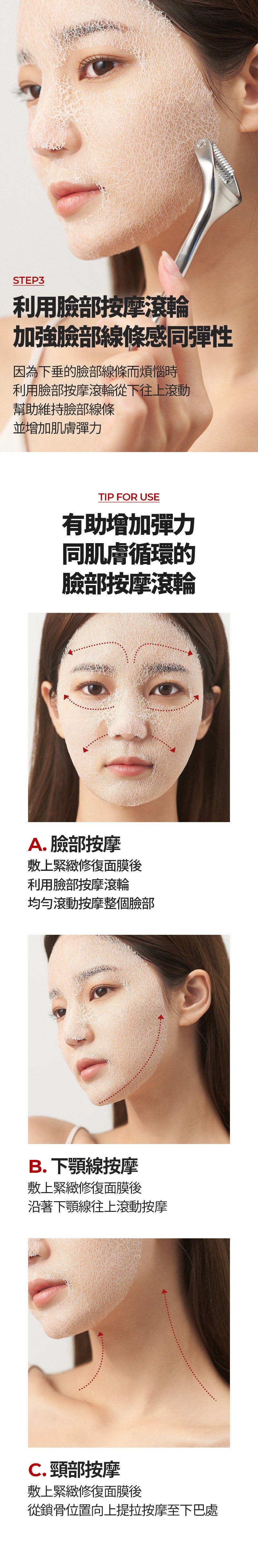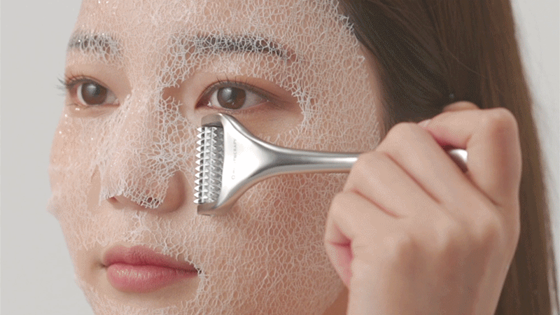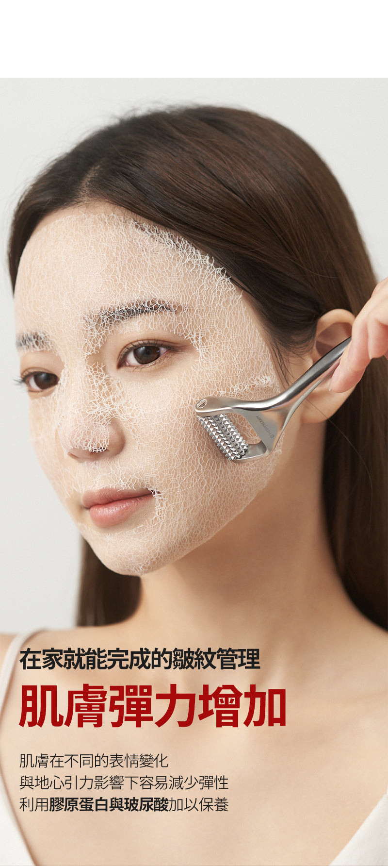 將儀器在面膜紙上滾動。膠原蛋白和玻尿酸將更容易被肌膚吸收。