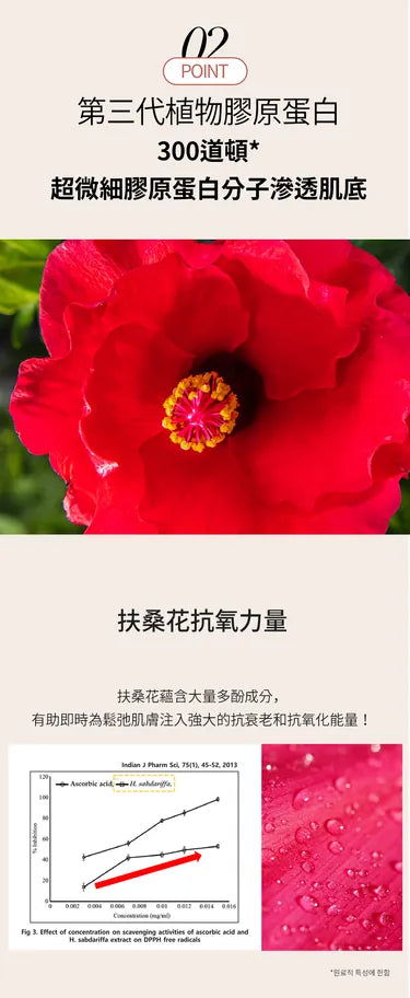 * 使用第三代植物膠原,相比起其他動物膠原,其微細分子更易被人體吸收