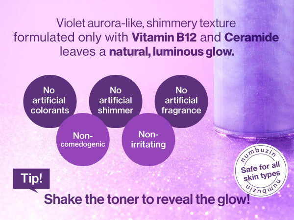 numbuzin這款爽膚水蘊含NAD+、鮭魚PDRN和50種勝肽,能提升肌膚彈性,煥活肌膚,由內而外散發光彩。其天然的紫色澤源自維他命B12和神經醯胺。配方溫和不致粉刺,適合敏感肌使用。