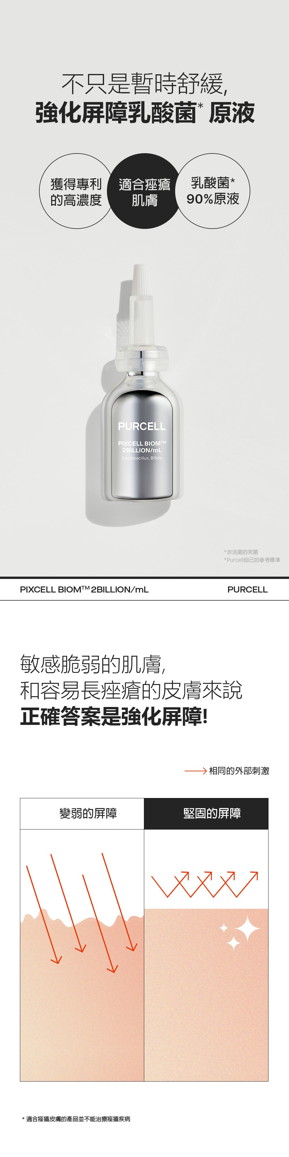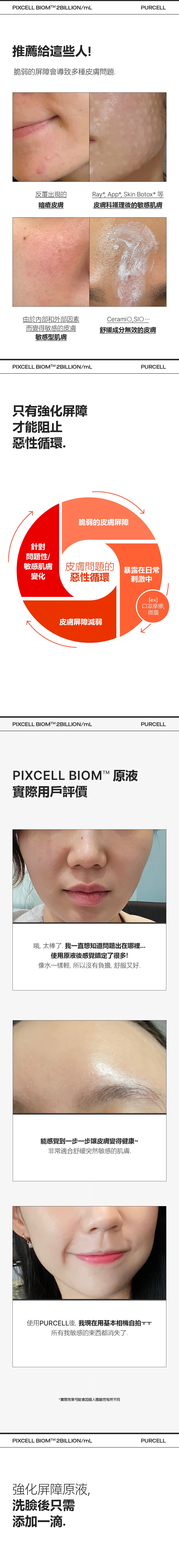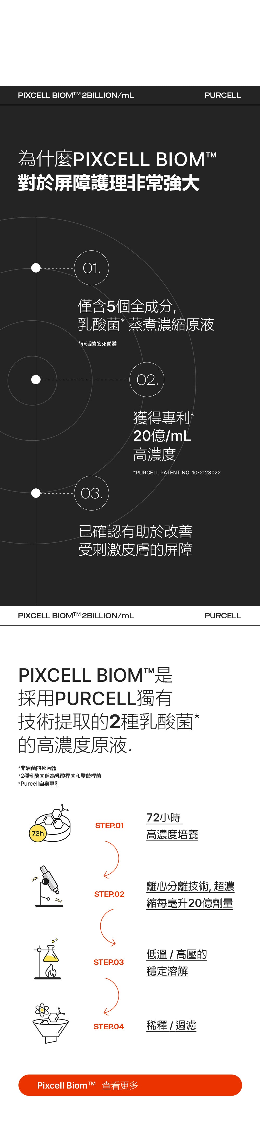 Pixcell Biom 源自濃縮液,富含 90% 的乳酸菌,具有強化屏障作用,改善皮膚屏障。強化肌膚屏障,保護肌膚免受外部刺激,有效舒緩受刺激的肌膚。