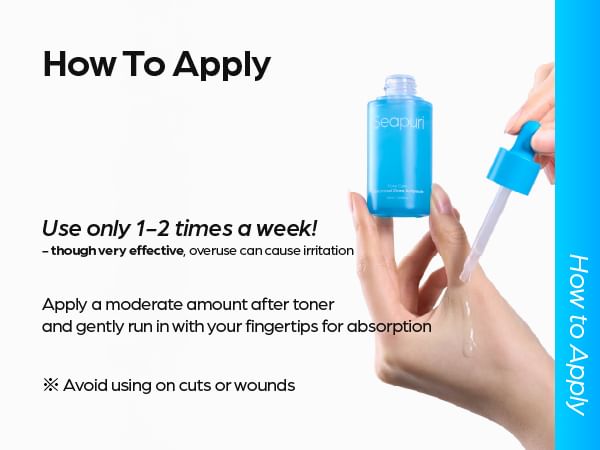 清潔後,取適量塗抹於全臉或問題區域(如 T 區),輕柔按摩至吸收。建議每週使用 1-2 次,避免過度使用以防肌膚負擔。若有傷口、嚴重敏感或異常反應,請停用並咨詢醫生。搭配 Seapuri 的 Shavik 冰河霜使用,可提升整體效果,早晚皆可。
