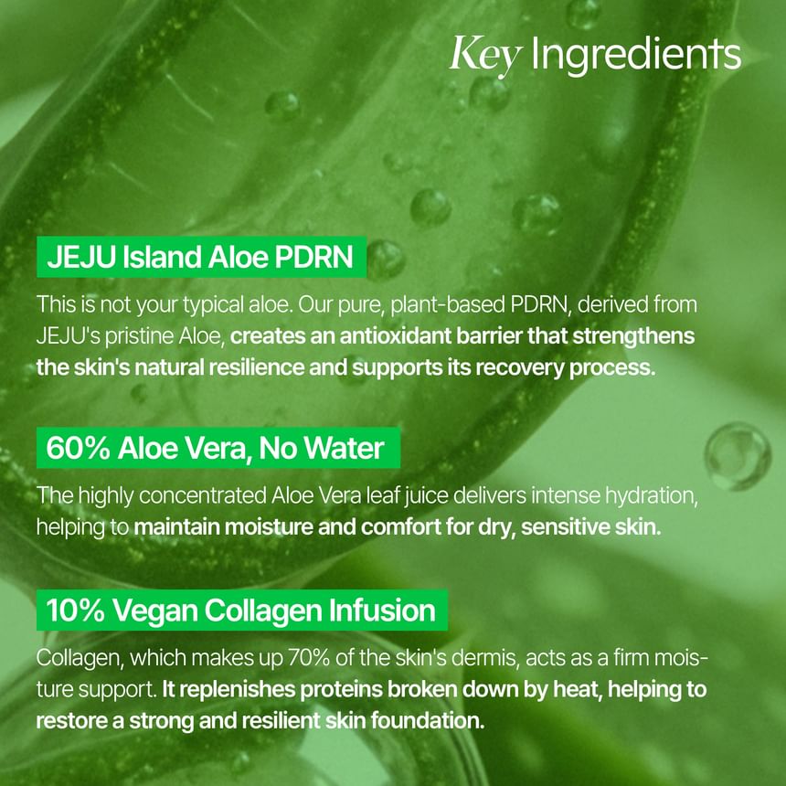 核心成分 PDRN:採用從濟州島有機蘆薈中提取的植物性 PDRN(聚脫氧核苷酸),有別於傳統的魚類 PDRN,可針對紫外線照射引起的熱量、炎症和氧化應激,形成抗氧化屏障,促進皮膚恢復和強化自然防禦能力。