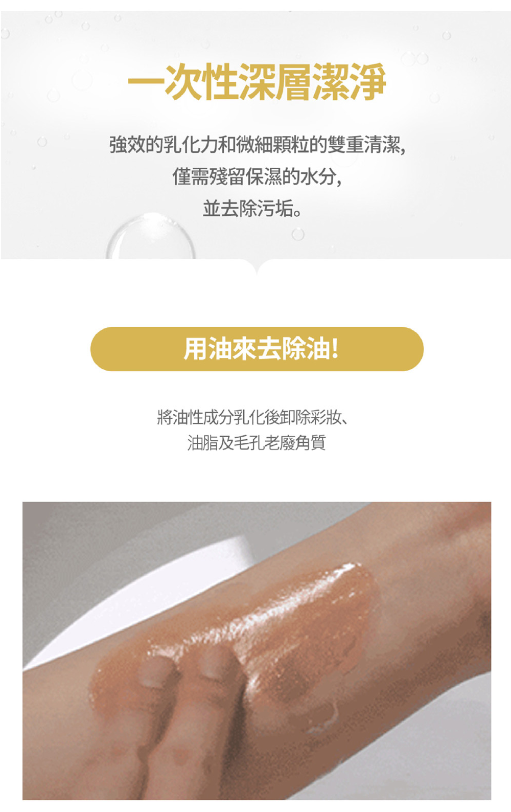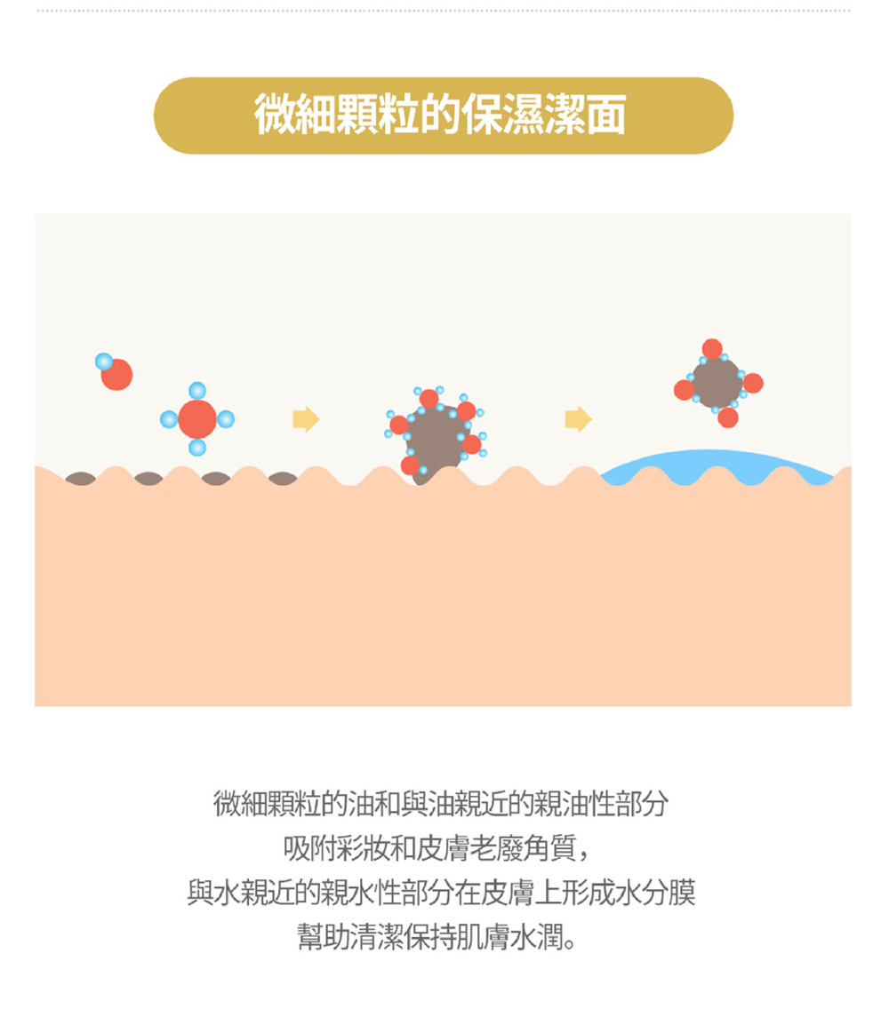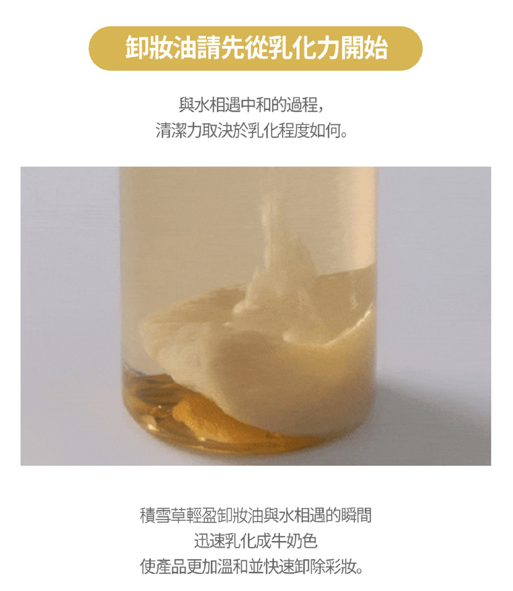 - 加入少量水,把臉上卸妝油乳化,溶解妝容