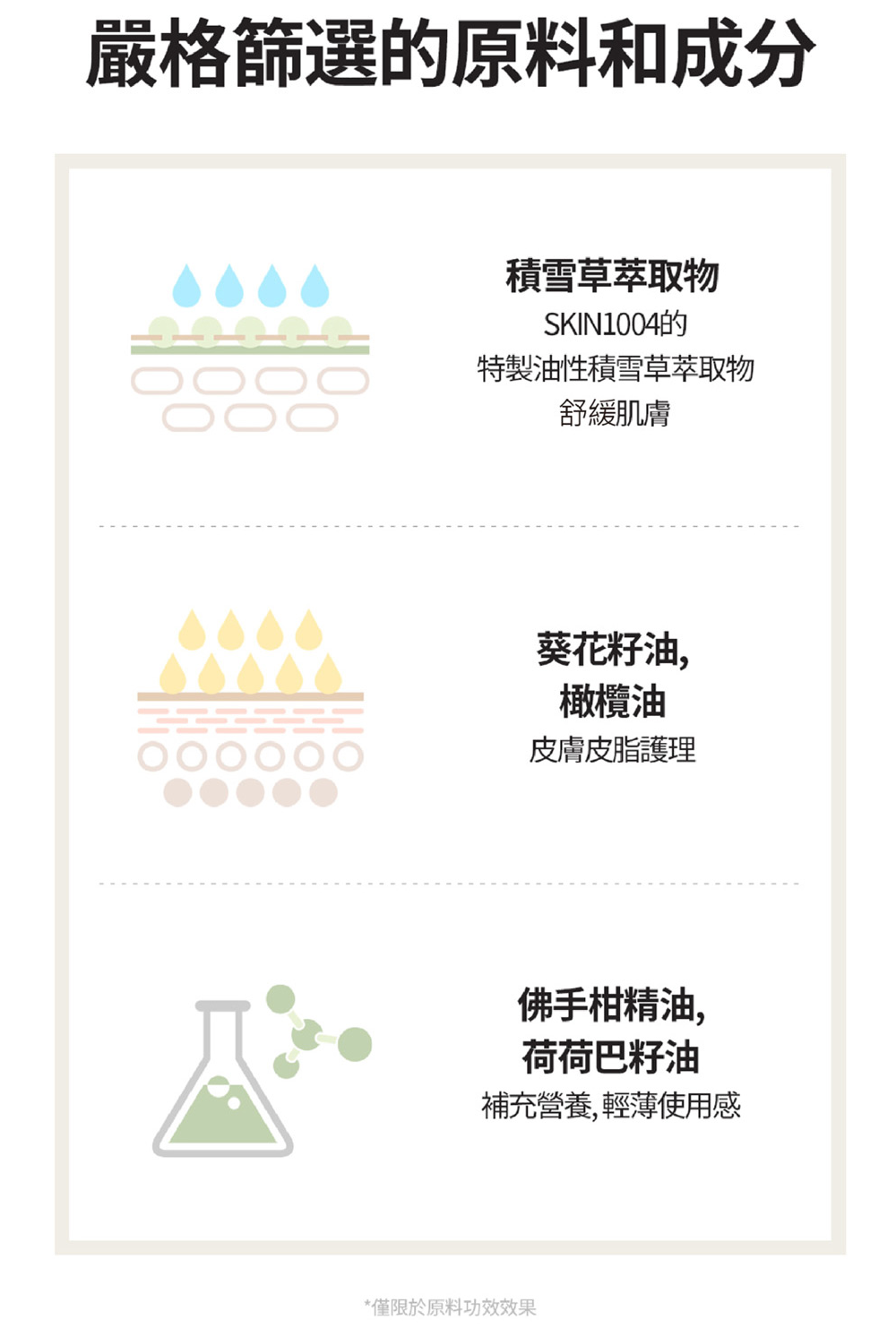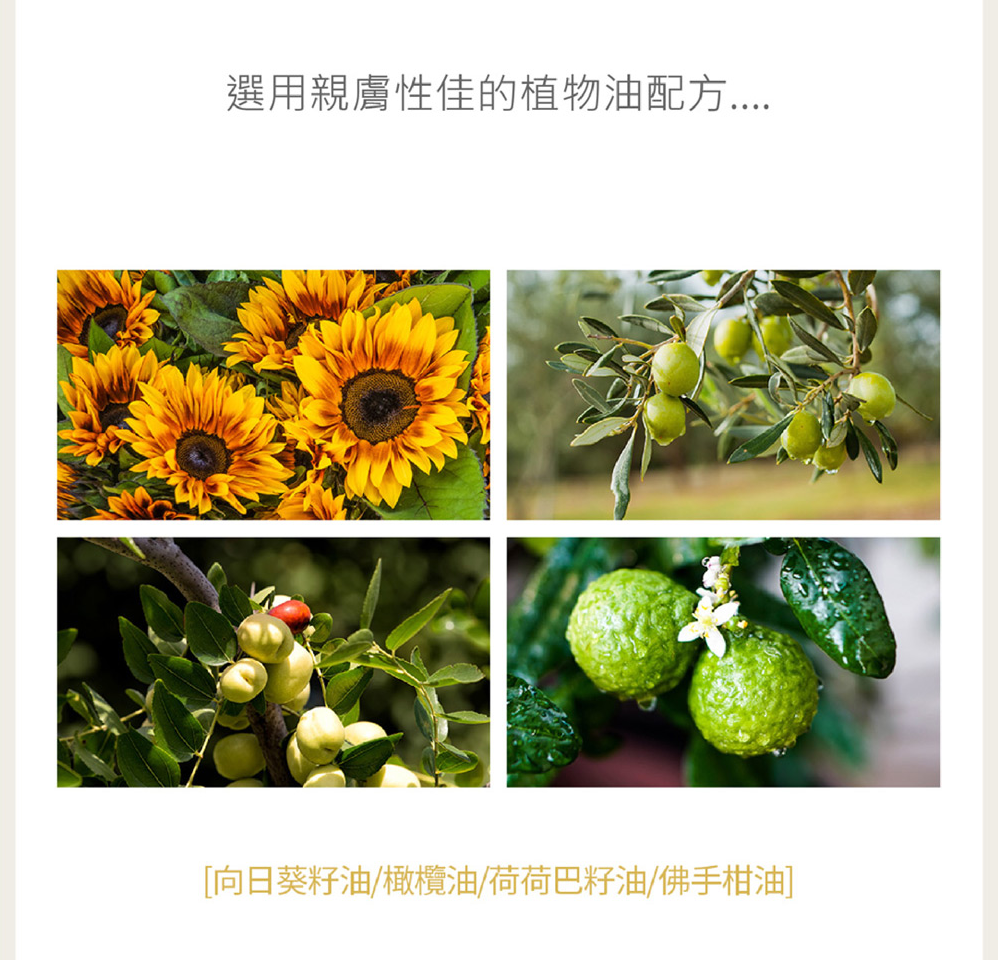 - 橄欖油(1,000 ppm)有助防止皮膚水分蒸發,並提供營養以緩解乾燥。