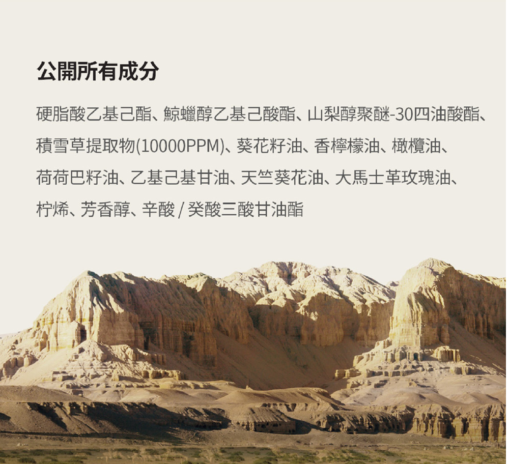 - 荷荷巴油(1,000 ppm)具有與人體皮脂相似的結構,因此與皮膚高度相容,有助為肌膚形成天然保濕屏障。