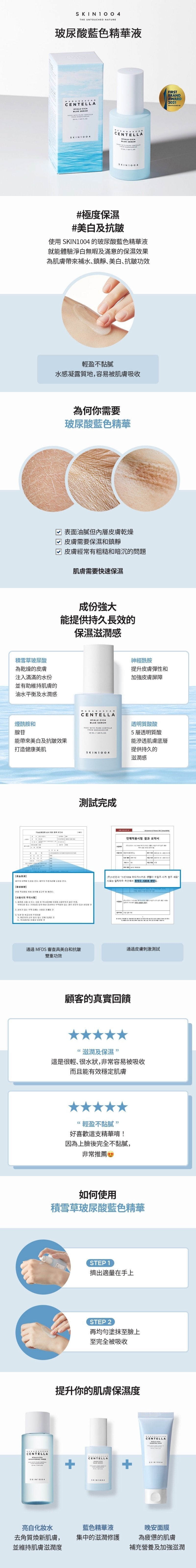 SKIN1004 理膚天使的小藍瓶精華是一款多功能的輕盈精華液。富含積雪草精華、五種透明質酸、神經酰胺納米粒子、煙酰胺及和腺苷,有效滋潤、舒緩、提亮肌膚,令皮膚全天保持水油平衡。