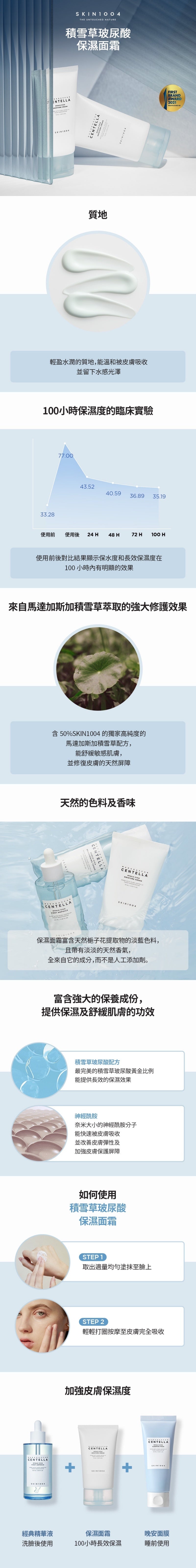 - Hyalu-Cica:由透明質酸+積雪草製成的獨特複合物,可提供水分,同時恢復皮膚屏障