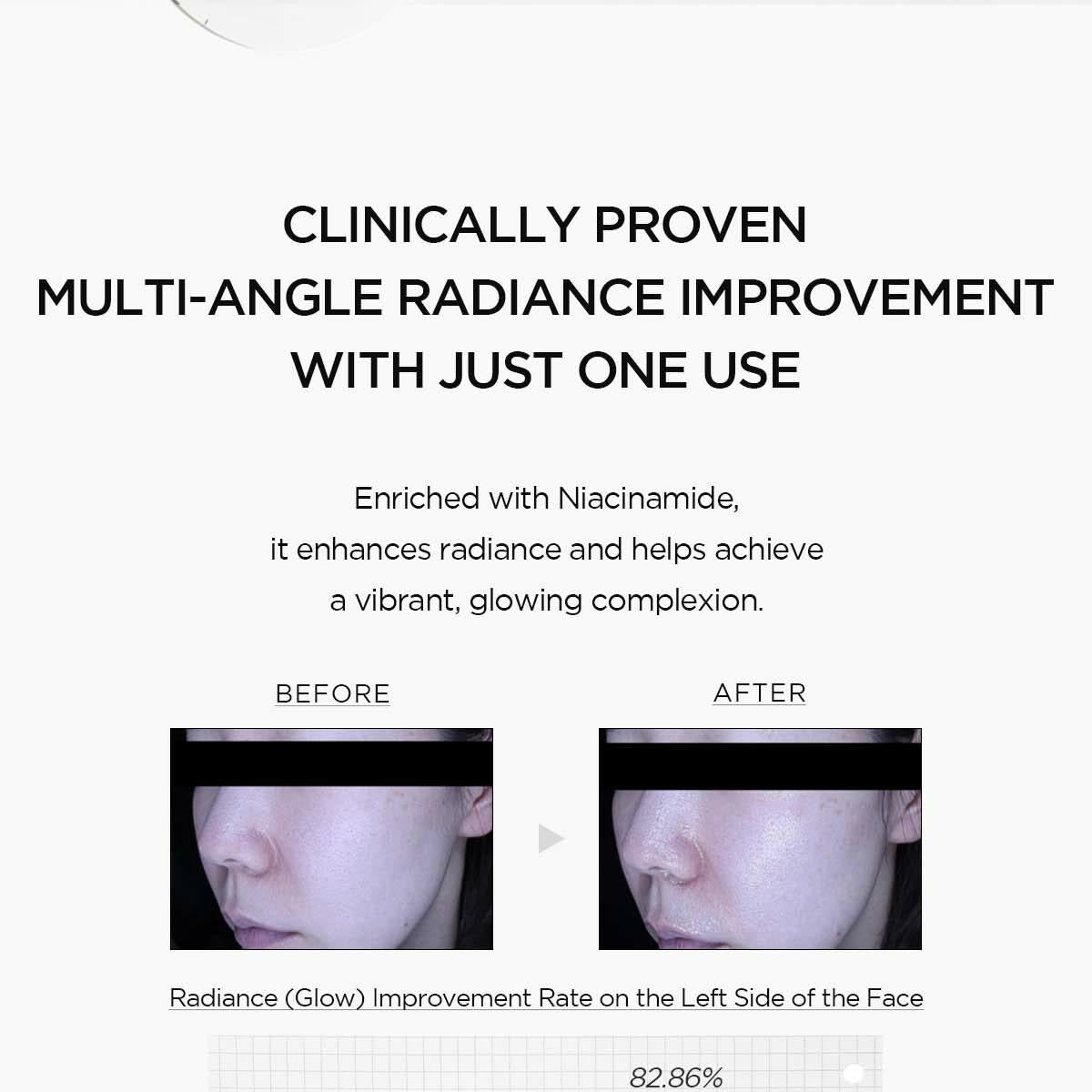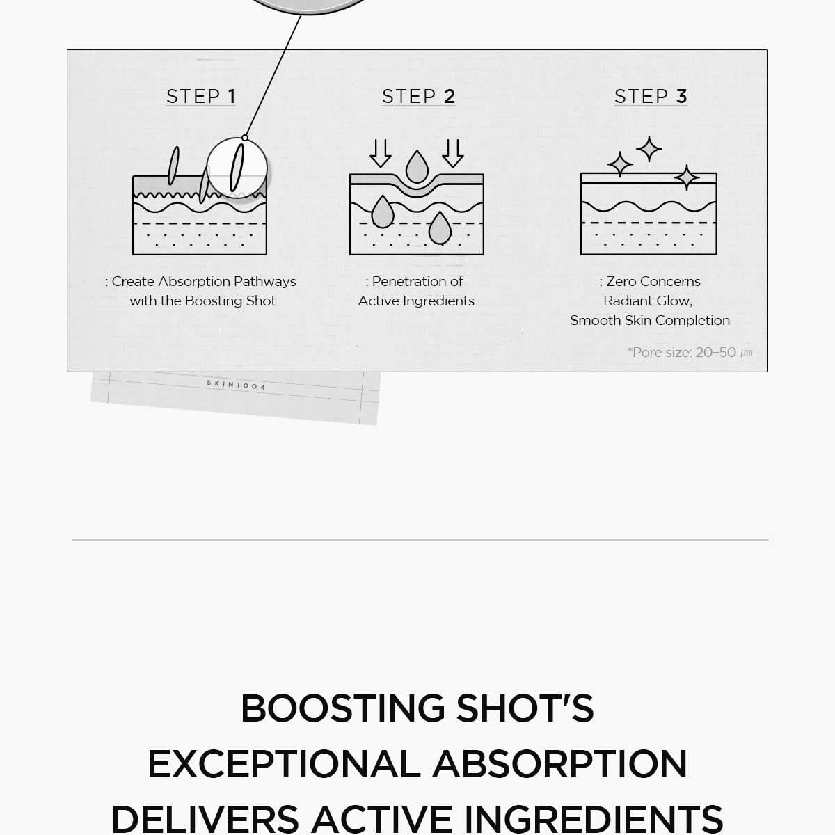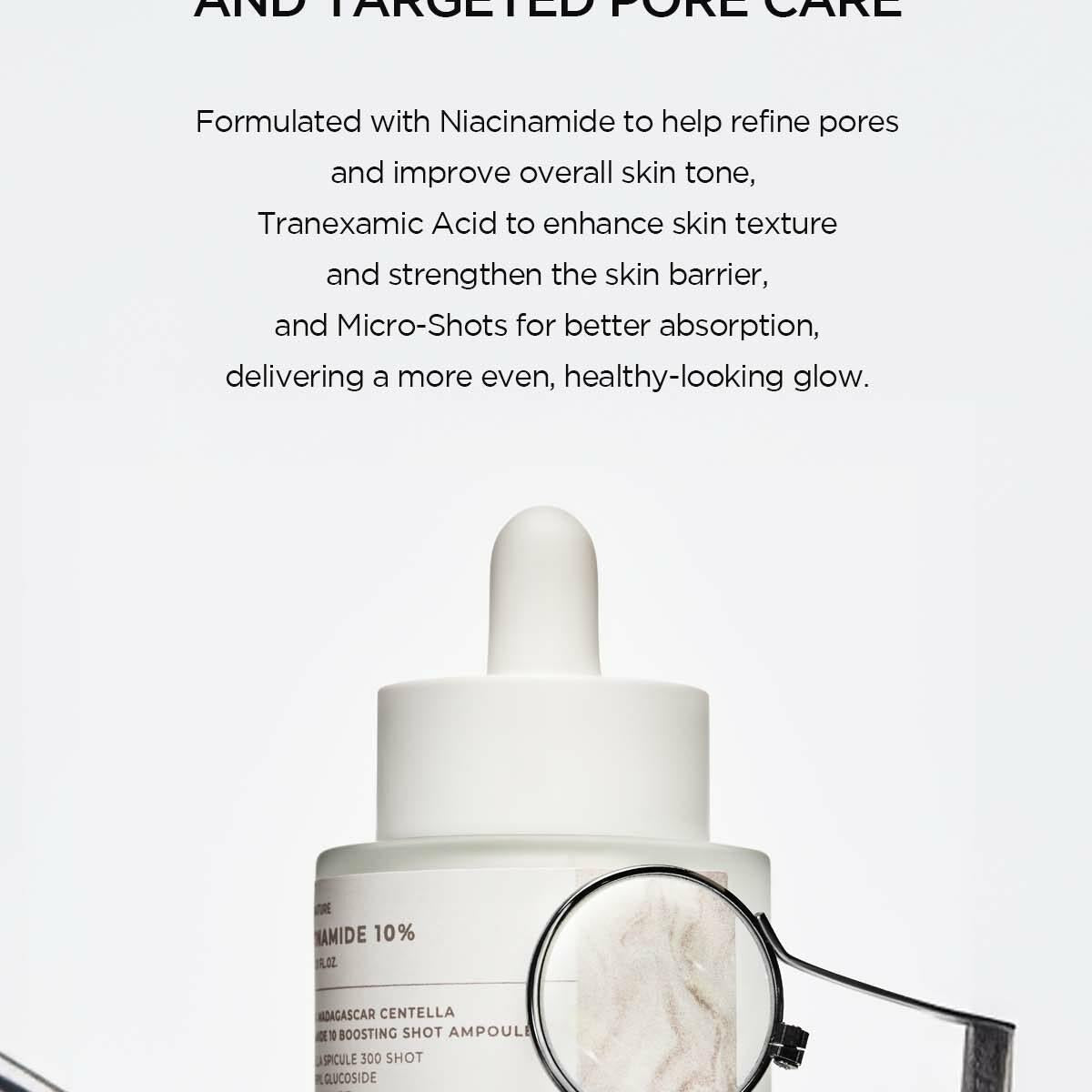 含有菸鹼醯胺,有助於細化毛孔、改善整體膚色;氨甲環酸,可改善膚質、強化肌膚屏障;Boosting Shot 系統可改善吸收,使肌膚更均勻、更健康。
