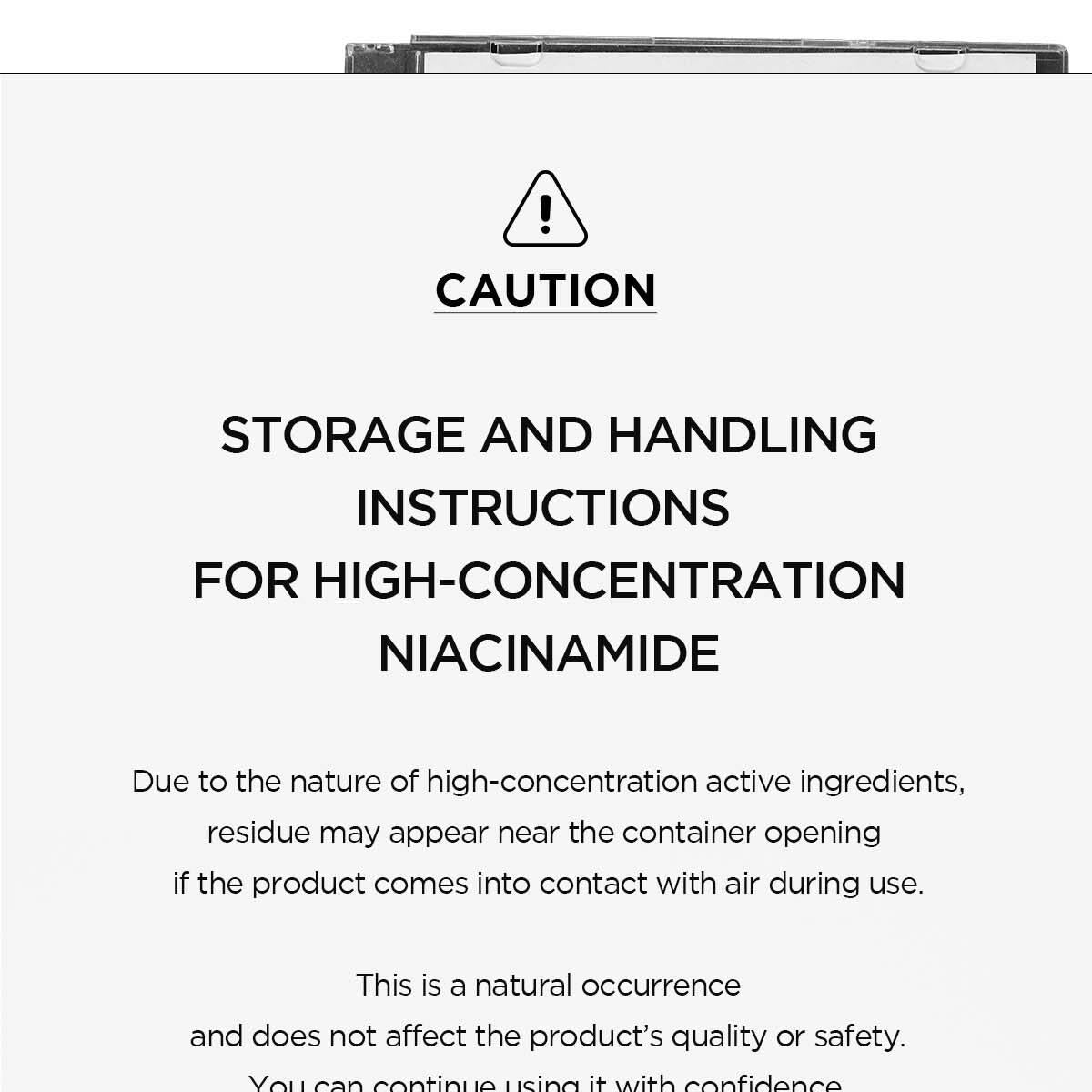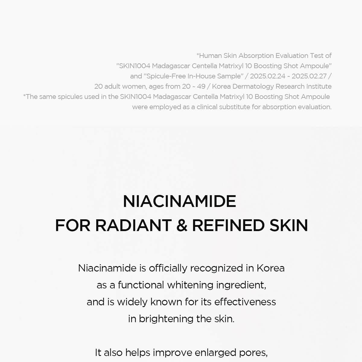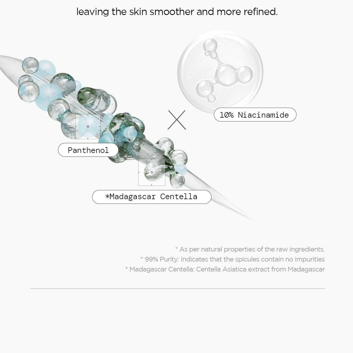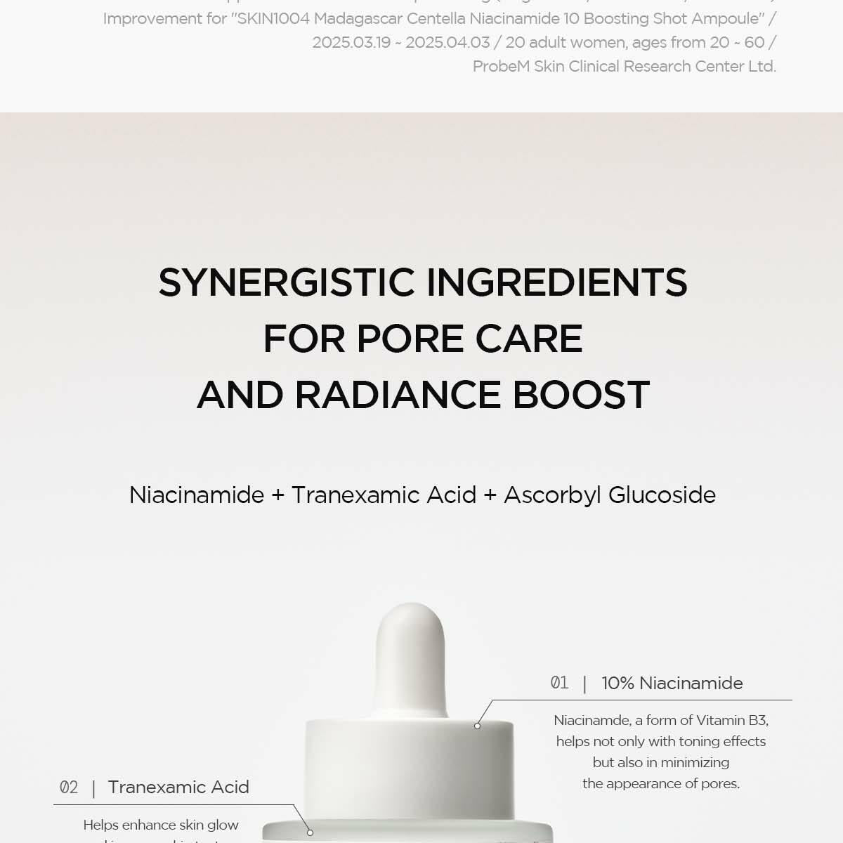 10% 菸鹼醯胺、馬達加斯加積雪草萃取物、泛醇、氨甲環酸、抗壞血酸葡糖苷、水解海綿(骨針)