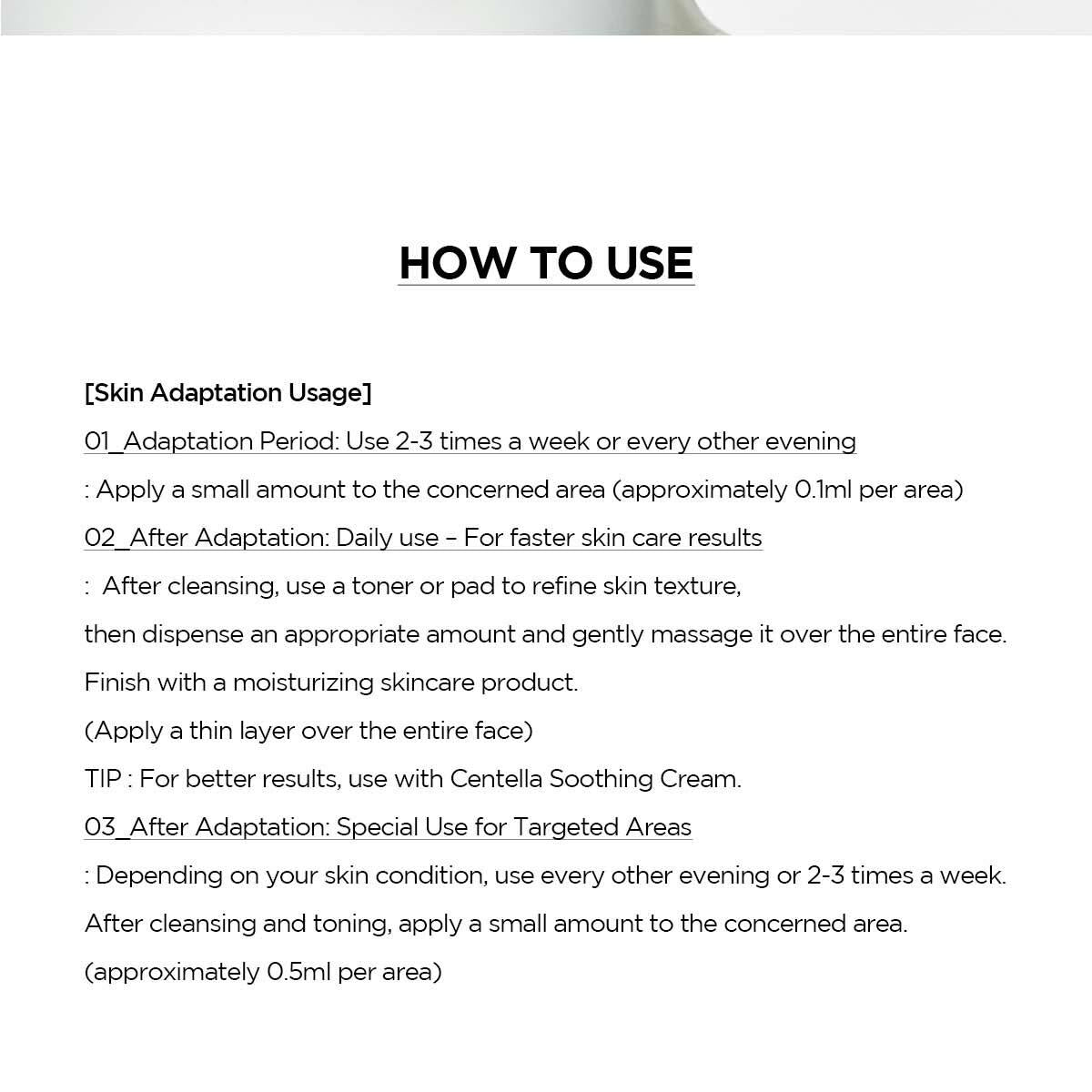 - 適應後可每日使用。爽膚後使用,並配合保濕產品使用,確保肌膚充分保濕。