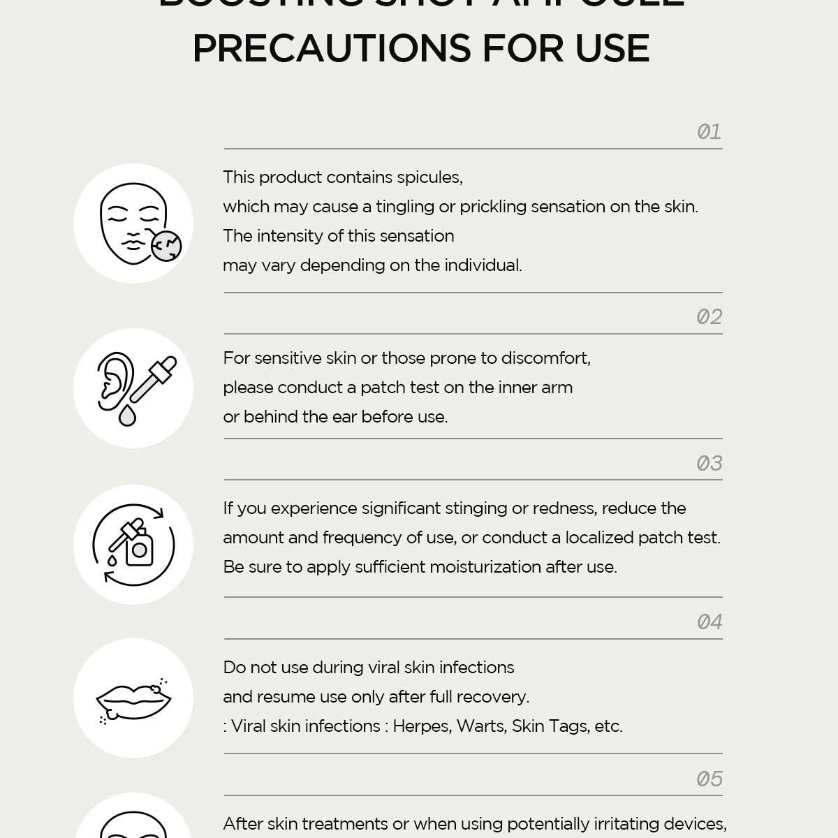- 本產品含有微針,可能會引起皮膚刺痛感。請勿在皮膚受刺激或其他感染時使用。
