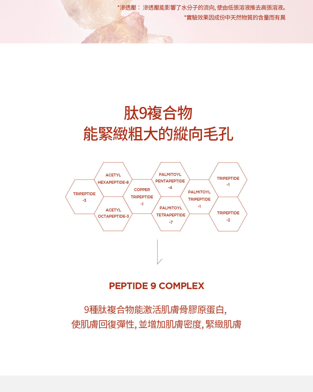 - 肽 9 複合物可促進膠原蛋白合成,增加皮膚彈性,收緊下垂毛孔