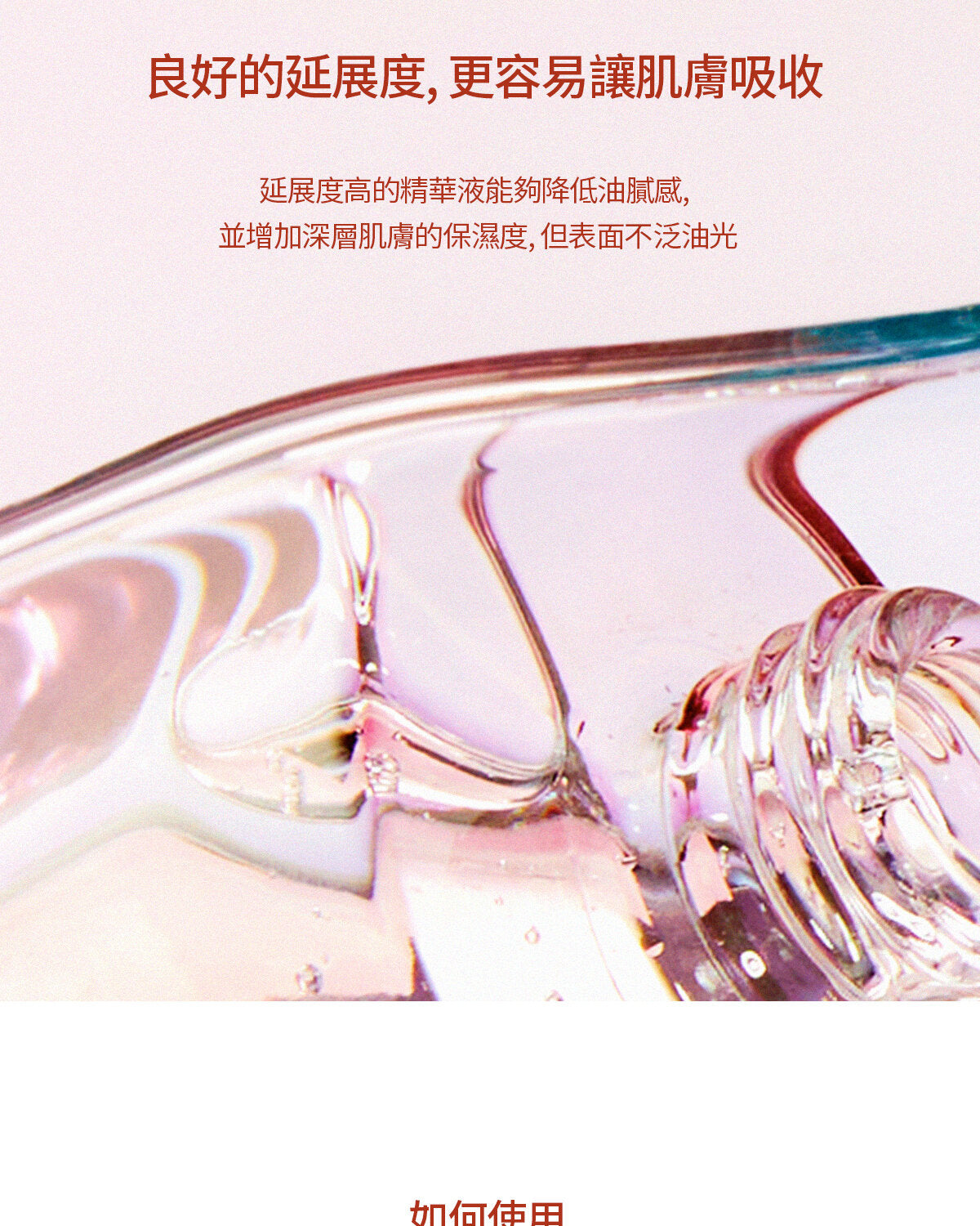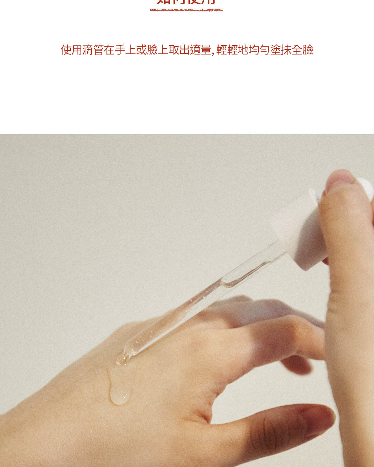 潔面及爽膚水後,以滴管取適量精華輕抹於全臉。輕拍肌膚以促進吸收。