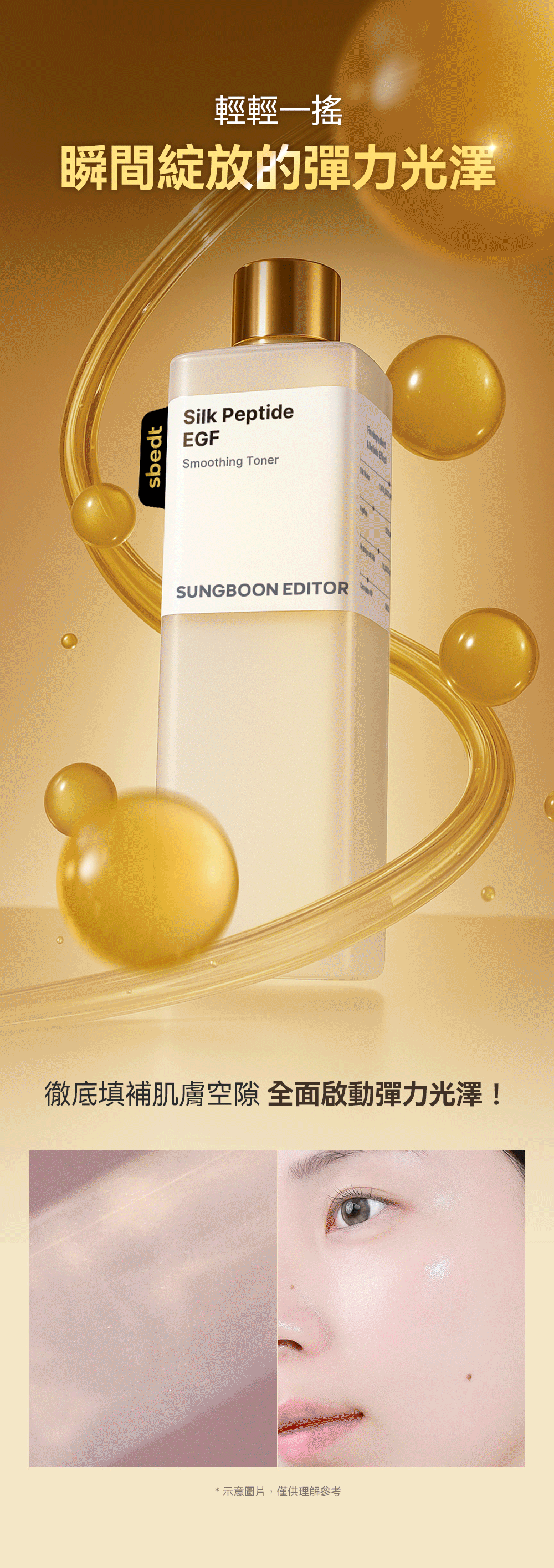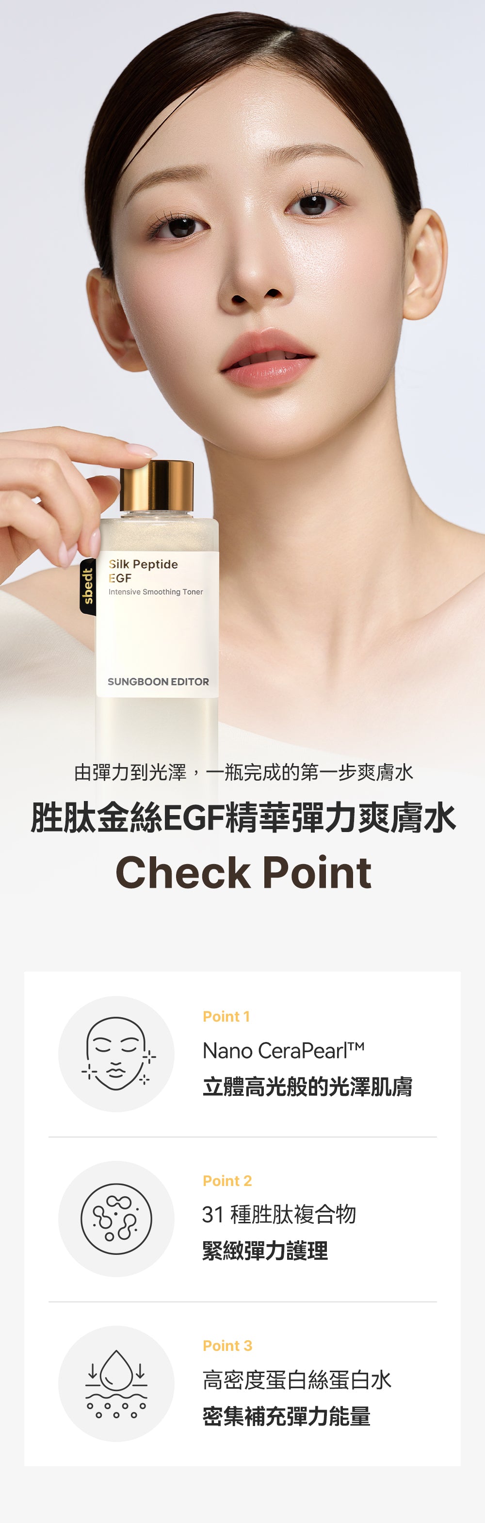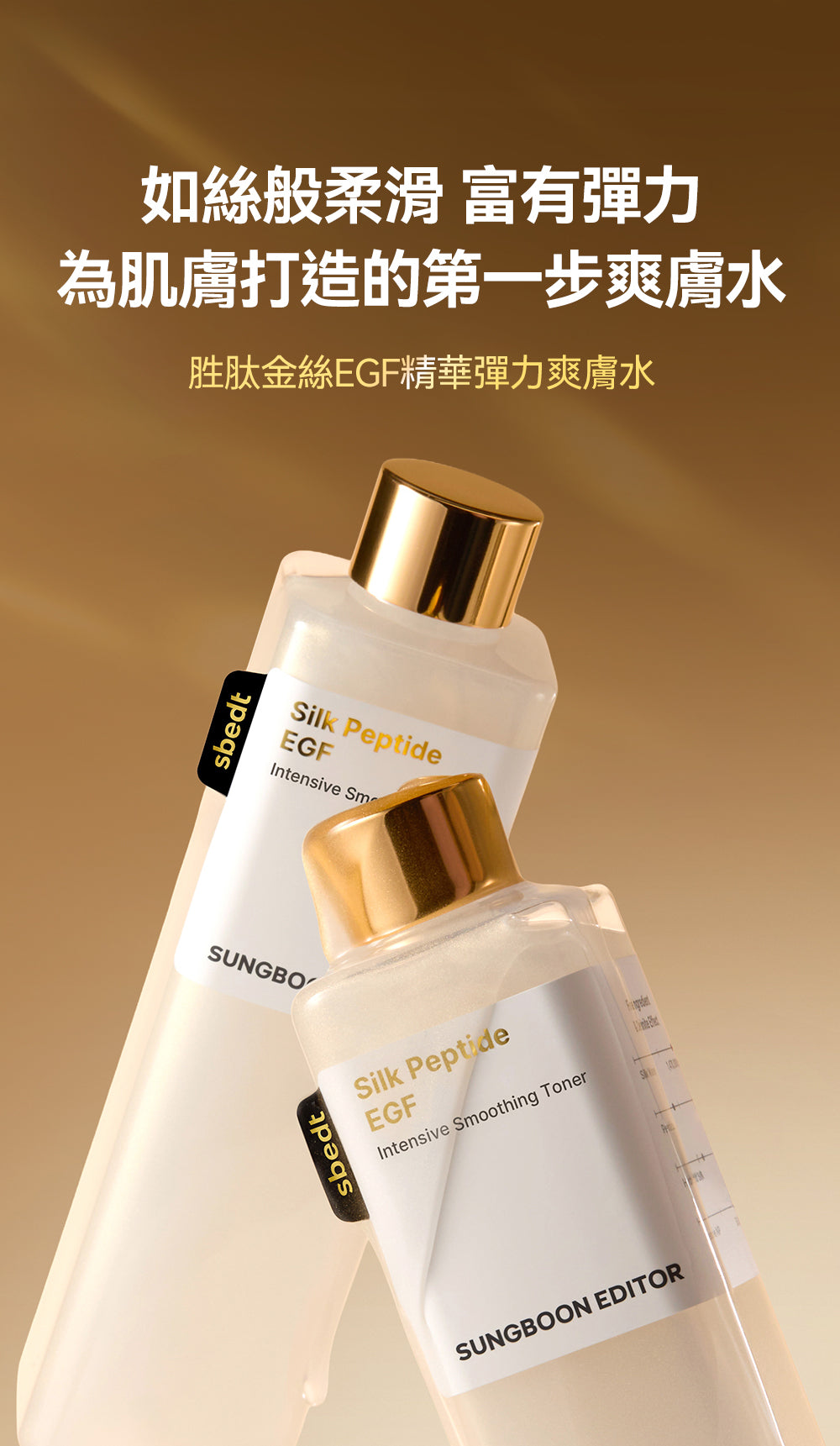 Sungboon Editor [奈米珠光科技] 胜肽金絲 EGF 精華彈力爽膚水 是韓國成分導向品牌 Sungboon Editor 的抗老彈力系列新品,主打「精華級爽膚水」概念,結合奈米珠光科技(nano-pearl光感技術)與胜肽金絲(Silk Peptide Gold)+ EGF 生長因子,專注即時提升肌膚彈力、光澤與緊緻感。被定位為「無針埋線」第一步保養,質地如精華般濃郁卻超好吸收,適合初老、鬆弛、乾燥缺彈力或追求光采彈潤的肌膚。常與品牌胜肽金絲 EGF 提拉精華/安瓶搭配使用,強化拉提與凍齡效果,在 Olive Young、Instagram 及香港/台灣代購平台討論度高。