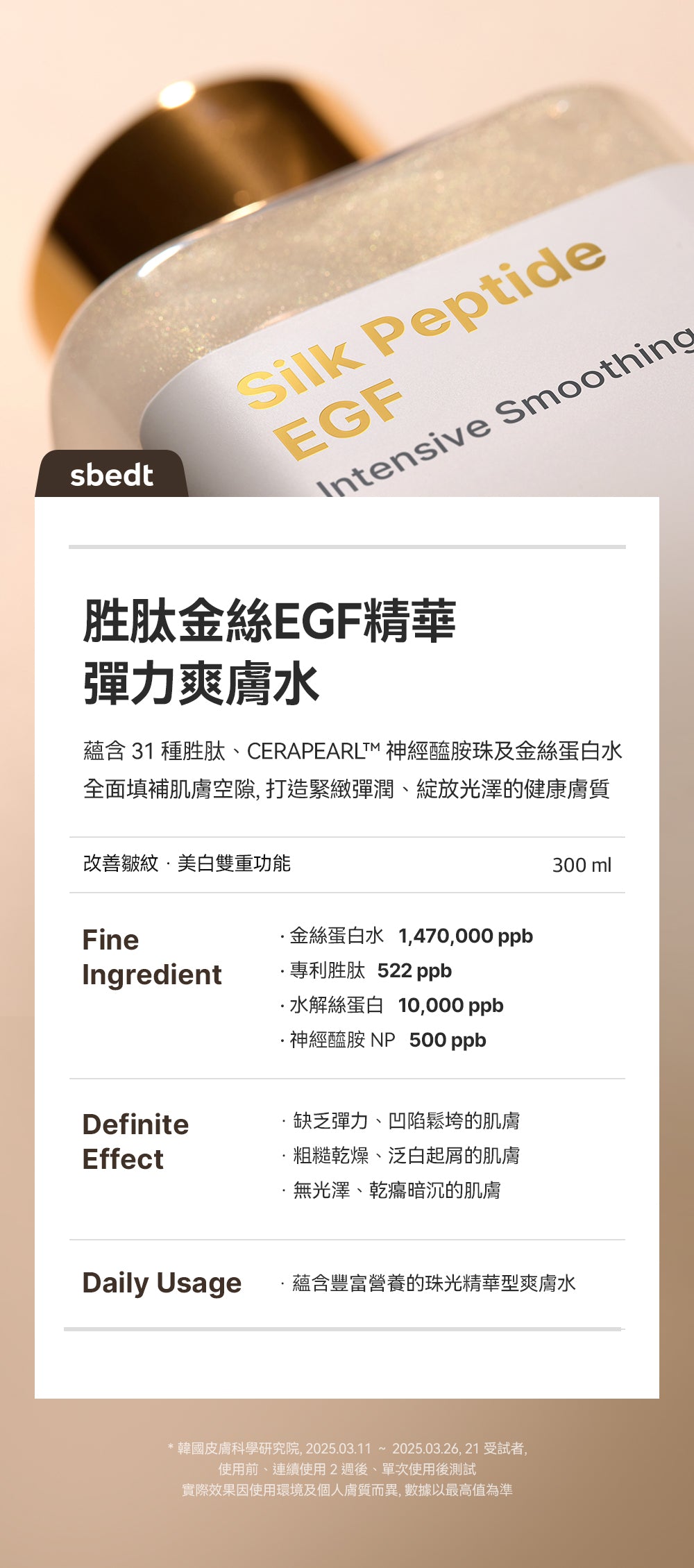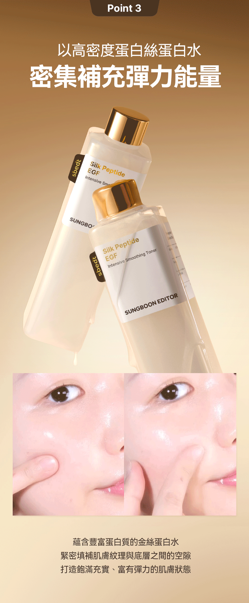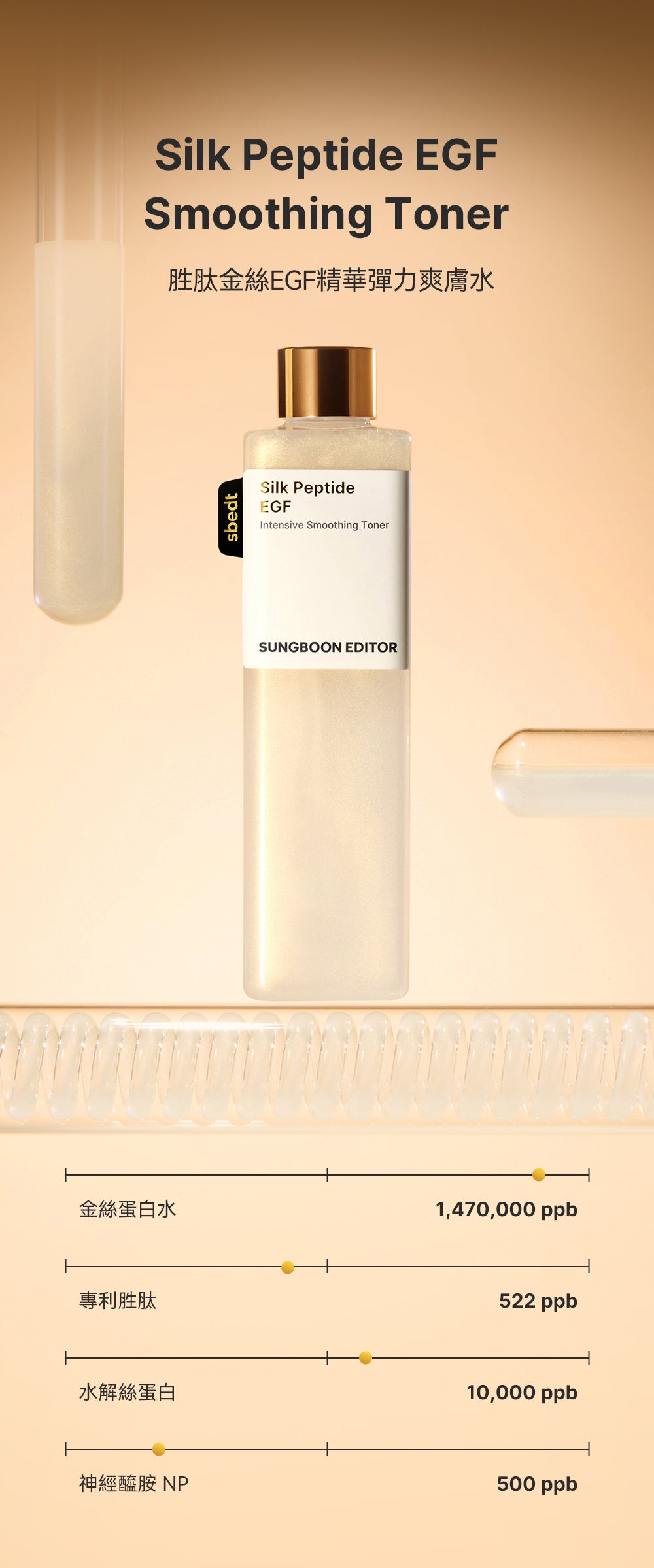Sungboon Editor [奈米珠光科技] 胜肽金絲 EGF 精華彈力爽膚水 是韓國成分導向品牌 Sungboon Editor 的抗老彈力系列新品,主打「精華級爽膚水」概念,結合奈米珠光科技(nano-pearl光感技術)與胜肽金絲(Silk Peptide Gold)+ EGF 生長因子,專注即時提升肌膚彈力、光澤與緊緻感。被定位為「無針埋線」第一步保養,質地如精華般濃郁卻超好吸收,適合初老、鬆弛、乾燥缺彈力或追求光采彈潤的肌膚。常與品牌胜肽金絲 EGF 提拉精華/安瓶搭配使用,強化拉提與凍齡效果,在 Olive Young、Instagram 及香港/台灣代購平台討論度高。