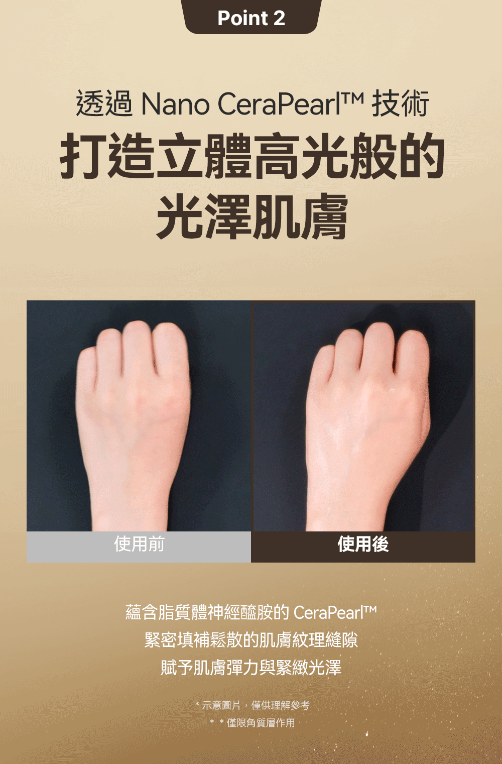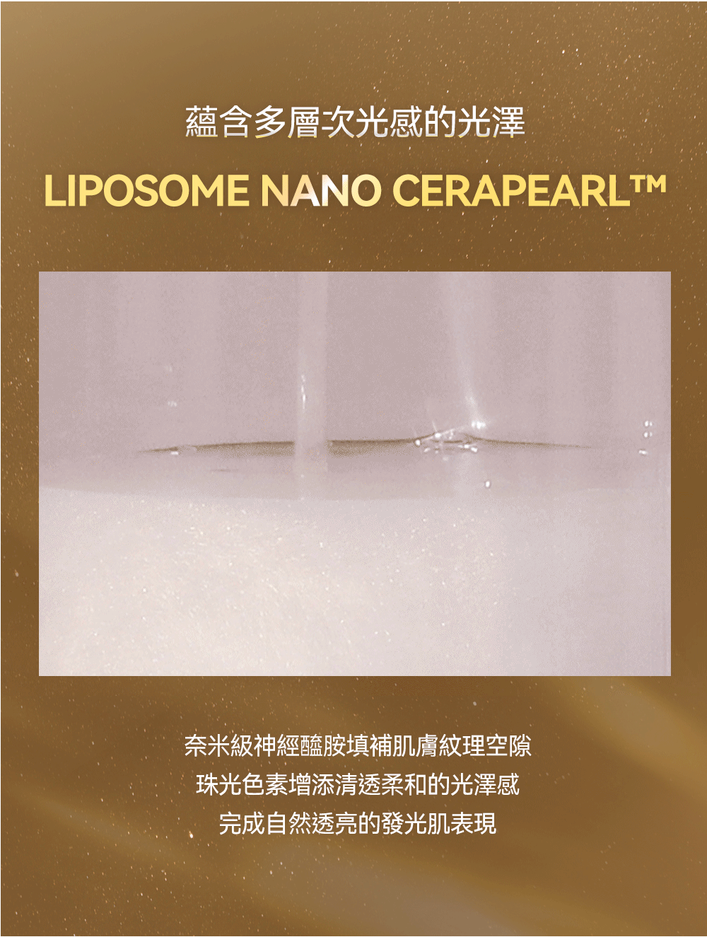 - 奈米珠光科技:奈米級珠光粒子,帶來即時光感提亮與柔焦效果,讓肌膚看起來更透亮、有光澤。