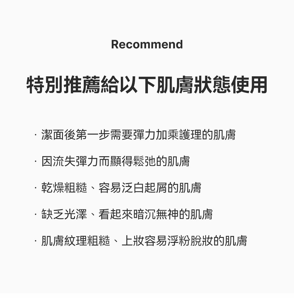 - 強化後續吸收:作為第一步精華爽膚水,提升後續精華/乳霜滲透率。