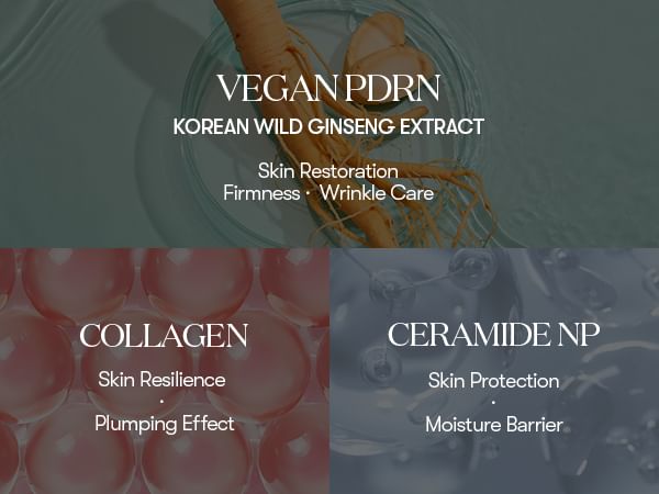抗皺與緊緻 產品含有植物來源的PDRN(來自韓國野山參提取物)、膠原蛋白及神經醯胺NP(Ceramide NP),有效減少細紋與皺紋的出現,特別針對眼周與頸部等脆弱部位,提升肌膚彈性與緊實度,促進健康光澤。