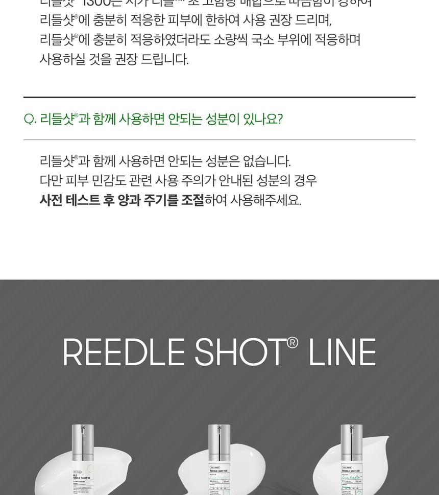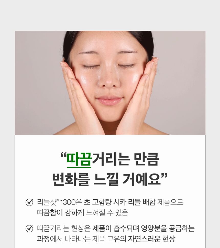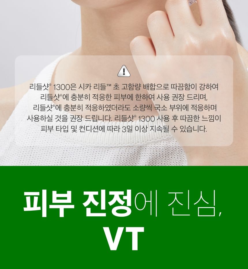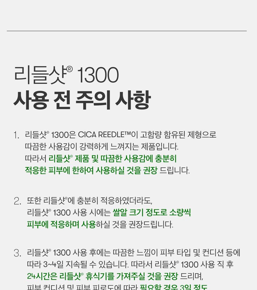 Riddle Shot 1300 含有非常高濃度的 Cica Riddle™,具有強烈的刺痛感。因此,建議僅在充分適應 Riddle Shot 的皮膚上使用。即使皮膚已充分適應 Riddle Shot,仍建議在局部區域少量使用。使用 Riddle Shot 1300 後的刺痛感可能會持續 3 天以上,具體取決於皮膚類型和狀況。