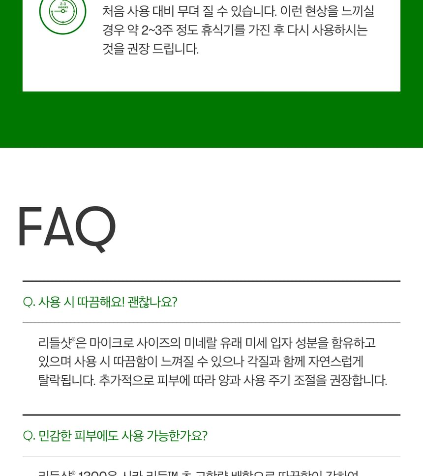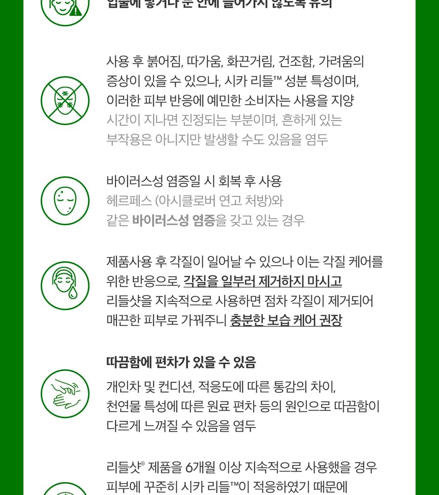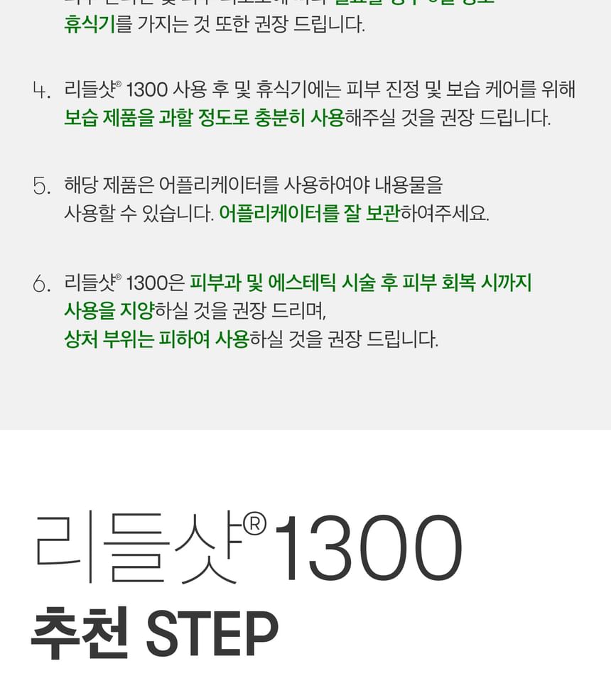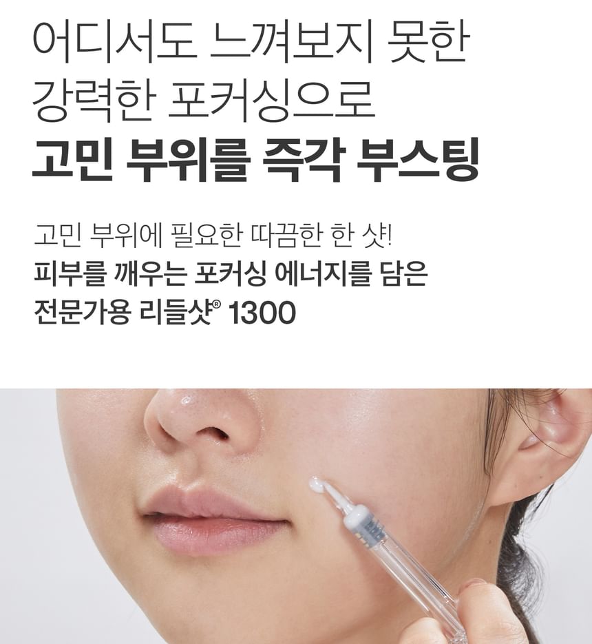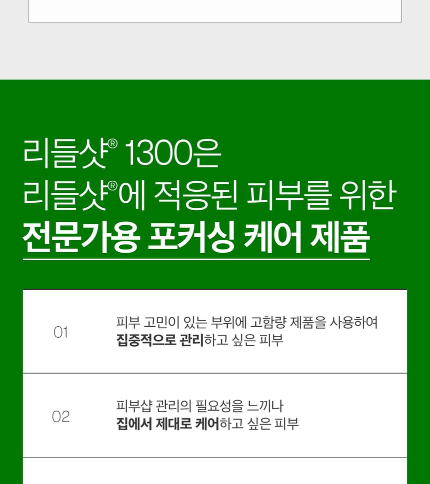 Riddle Shot 1300 含有非常高濃度的 Cica Riddle™,具有強烈的刺痛感。因此,建議僅在充分適應 Riddle Shot 的皮膚上使用。即使皮膚已充分適應 Riddle Shot,仍建議在局部區域少量使用。使用 Riddle Shot 1300 後的刺痛感可能會持續 3 天以上,具體取決於皮膚類型和狀況。