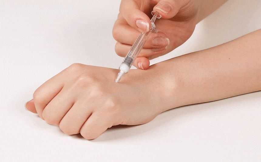 1. 於護膚程序的第一步,取適量微針精華,按壓塗抹在已經潔淨的肌膚上。